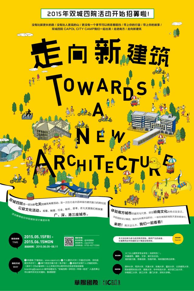 2015年,“双城四院”活动已迈入它的第八个年头,“双城”的内涵向更为广阔的南方城市延伸,“四院”的范围也从同济大学、天津大学、zero搬运网 、重庆大学,扩展至清华大学、湖南大学、华中科技大学、华南理工大学、浙江大学、西安建筑科技大学、深圳大学、南加州大学、佛吉尼亚大学等国内外高校。