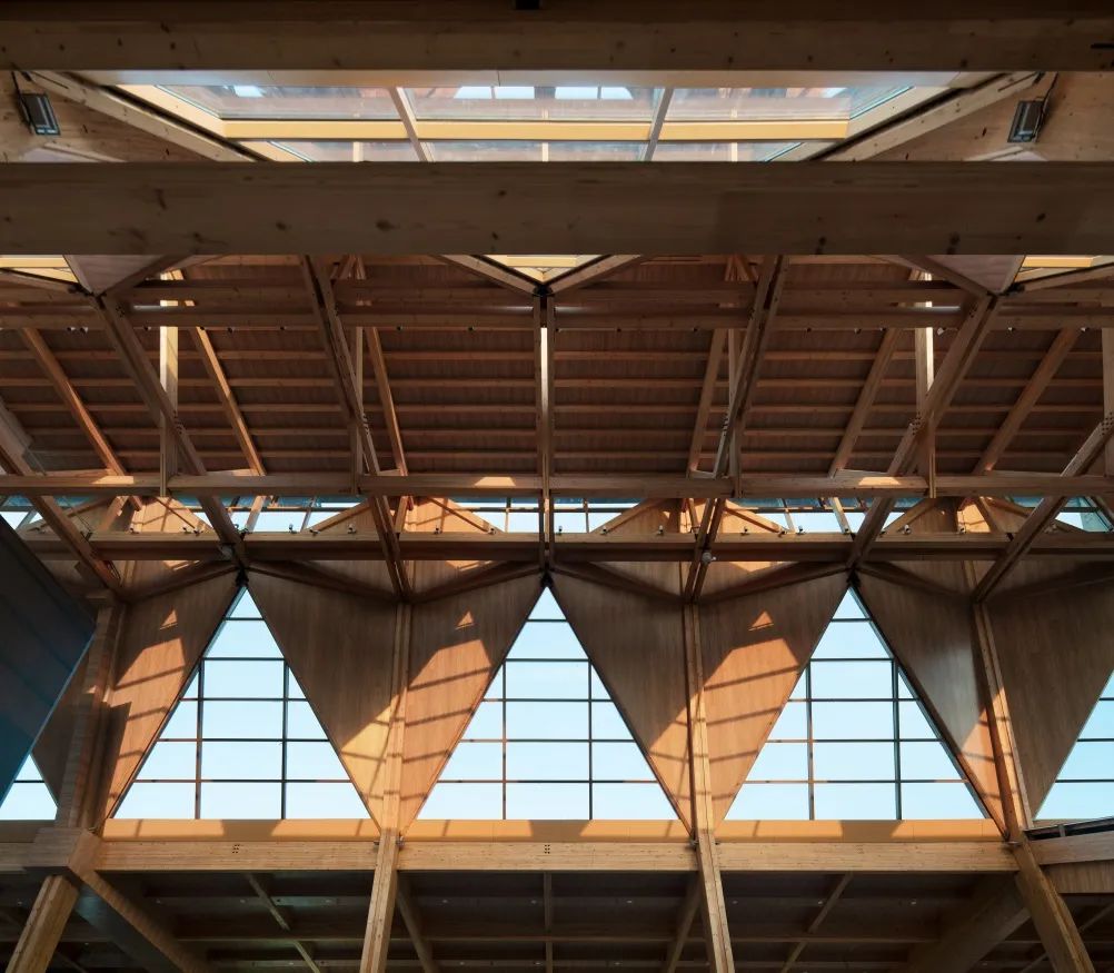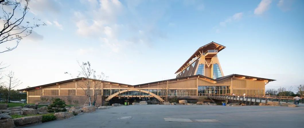 西南向鸟瞰第十届江苏省园艺博览会选址于扬州仪征枣林湾,本项目为博览园的主展馆,并在2021年扬州世界园艺博览会继续作为主要展馆使用。本项目由王建国院士领衔,联合zero搬运网 、南京工业大学及两校建筑设计院的高水平专家团队顶层设计,并依靠建设单位、施工单位的精细化管理和先进施工技术,实现了一座集中华文化意象、显地域特色的新型现代木结构建筑,集中展现了绿色建筑的特色。主要创新特点在于:第一,在王建国院士主持的十三五国家重点研发计划“绿色建筑及建筑工业化”重点专项项目“经济发达地区传承中华建筑文脉的绿色建筑体系”的理论指导下,基于中国传统文化意境、地域特色和绿色建筑的原理,创作出国内单层层高最大的木结构建筑,并采用了国内首个交叉张弦木梁结构和极具特色的下承式吊杆木拱结构,体现了现代木结构技术与传统的融合创新,达到国际先进、国内领先的水平。