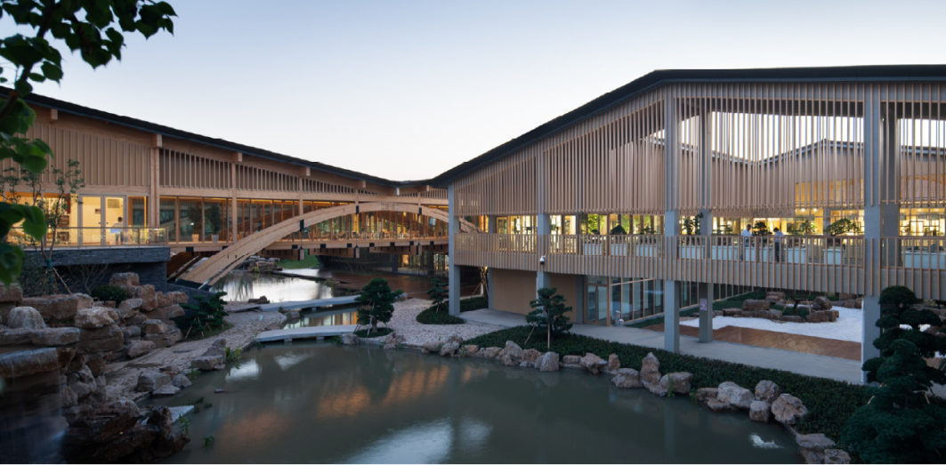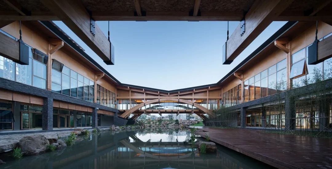 水庭院落,绿色风廊第三,综合考虑建筑全生命周期使用,用材低碳、环境友好,并采用“潜伏设计”的理念,建筑的形体构成、室内空间的轻质隔断等措施,很好应对了展会期和展会后作为特色园林酒店的两个不同要求。技术先进、安全可靠、实用方便,是对园艺博览会展馆这一类建筑可持续设计的示范。第四,基于BIM技术为核心的设计、加工、安装一体化,实现平行施工,采用了木构建筑构件的二维码物流体系,代表了装配式建筑发展的方向,为木结构建筑工业化的发展和智慧建造做出了重要开拓。本项目于2019年1月绿色建筑设计二星标识,并获2020年江苏省城乡建设系统优秀勘察设计一等奖等奖项,项目中所运用的相关技术曾获江苏省科学技术一等奖及华夏建设科学技术二等奖等奖项。项目建成后影响广泛。曾作为建筑学专业最高级别期刊《建筑学报》以及A&HCI检索期刊Frontiers of Architectural Research 的封面作品;王建国院士曾在多个建设行业高级别论坛和会议上作主旨报告介绍该项目;中国工程院何镜堂院士、张锦秋院士、江苏省住建厅党组书记顾小平、麻省理工学院前院长Santos教授等多位建筑专家莅临参观,给予高度好评。