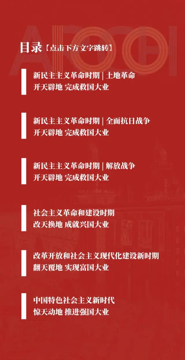展馆内容按照时间线索分为6章,参观者进入线上展馆,点击目录中的文字,即可进入相应的历史阶段分目录,点击想要参观的章节或项目即可快速跳转。