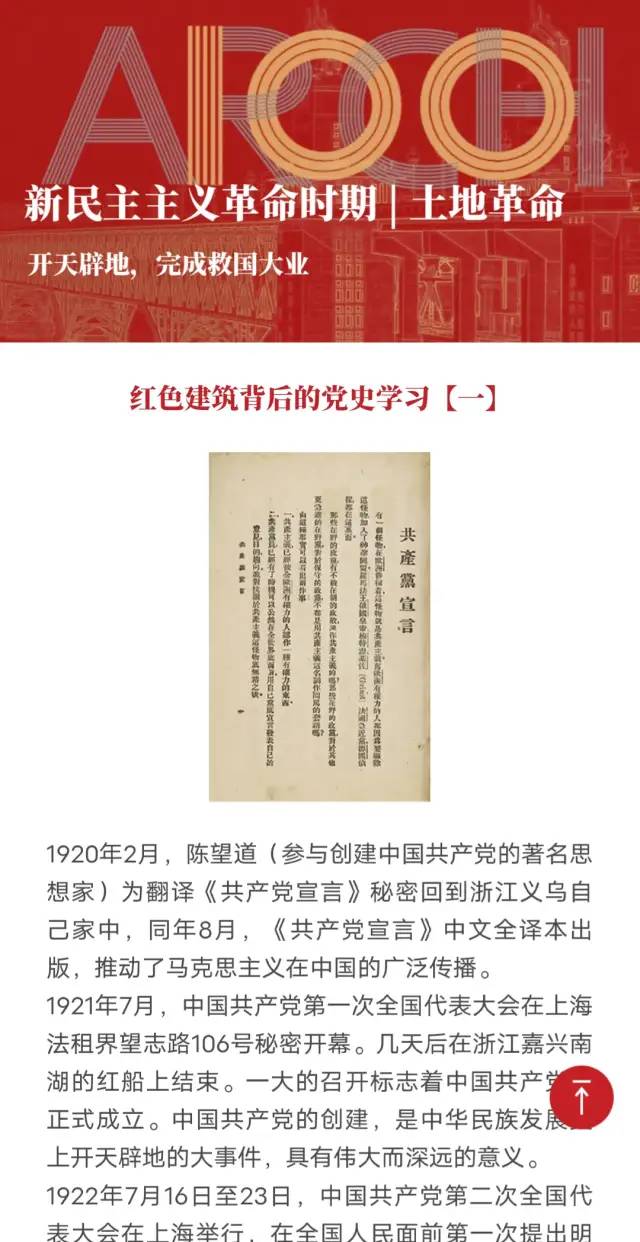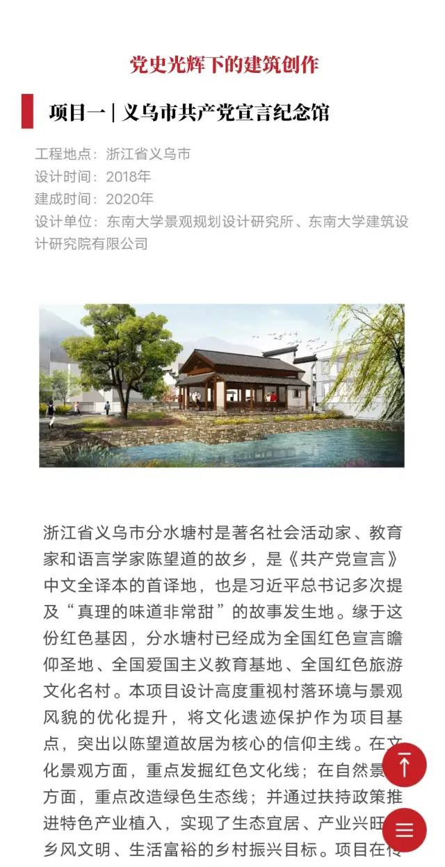 “线上展馆”以新媒体技术为依托,梳理了自新中国成立以来东大建筑设计作品中逾60件红色建筑、规划、景观的实践案例,以中国共产党的4个历史阶段为时间线索,串联起红色建筑下的党史记忆。以“云展览”形式讲述中国共产党百年辉煌的东大建筑叙事,把红色建筑和党史事件相结合,将党史学习和思政教育相融通。