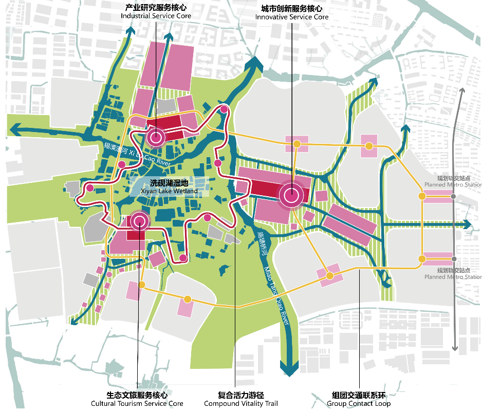 设计说明:滨水区由于其所在的特殊空间地段,往往具有城市的门户和窗口的作用。因此,全面、科学地开展针对城市中心滨水地区的功能和景观改造显得尤为重要。本次课程中学生结合真实城市设计实践项目探讨生态景观理论方法介入数字化滨水地段城市设计。选地位于将承载长三角区域一体化发展国家战略的无锡市洗砚湖区域。本次设计以“湖荡绿芯· 科创智城”为理念,以“湖荡+”科创园为目标引领,构建“湖荡六问”多维评价模型,提出了“湖荡+”生态网络、“湖荡+”产业格局、“湖荡+”交通体系、“湖荡+”宜居空间、“湖荡+”特色文旅五大战略。在课程中学生学习生态科技城谱系研究、滨水生态环境保护下的低影响开发研究、城市物理环境研究等多方面专项研究,采用数字化设计技术方法,对无锡洗砚湖地段进行生态科技城为主题的城市设计,为无锡市未来的规划建设提出限制与引导。