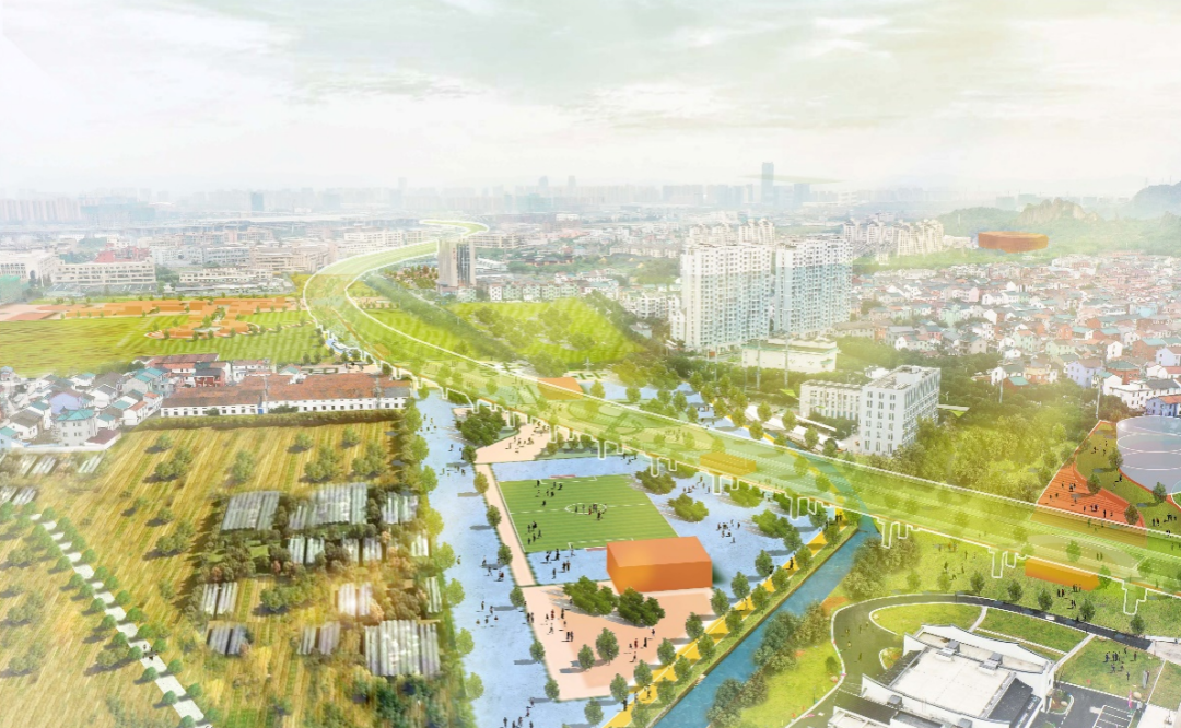 在乡村振兴的建设中,生态环境是所有生产生活的基底,以生态文明建设为导向的乡村自然共生发展是未来乡村发展的大趋势,但城市建设引发的乡村生态空间的废弃与破坏却在反复上演。面对柯桥区齐贤村特殊的环境条件,我们以“超级绿线”为主题,从区域层面出发,以景观设计作为城乡消极空间更新主要手法,通过建设和完善城市基础设施附属空间,构建柯桥区的超级绿线生态网络。进而以“超级绿线”作为乡村振兴手段介入,从乡村最重要且最基础的景观及基础设施入手对高架桥下失落空间及周边空间进行更新,激活场所,联动周边核心节点以协同区域发展,促进要素交流互动。将齐贤村打造为一个集绿色宜居、文化观光、创新产业于一体的生态特色文化示范水乡。