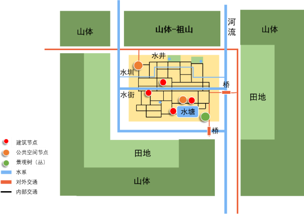 中观基因:因山就势,傍村成田,三级圈层;得水结村,理水而用;背靠祖山,水口屏村。