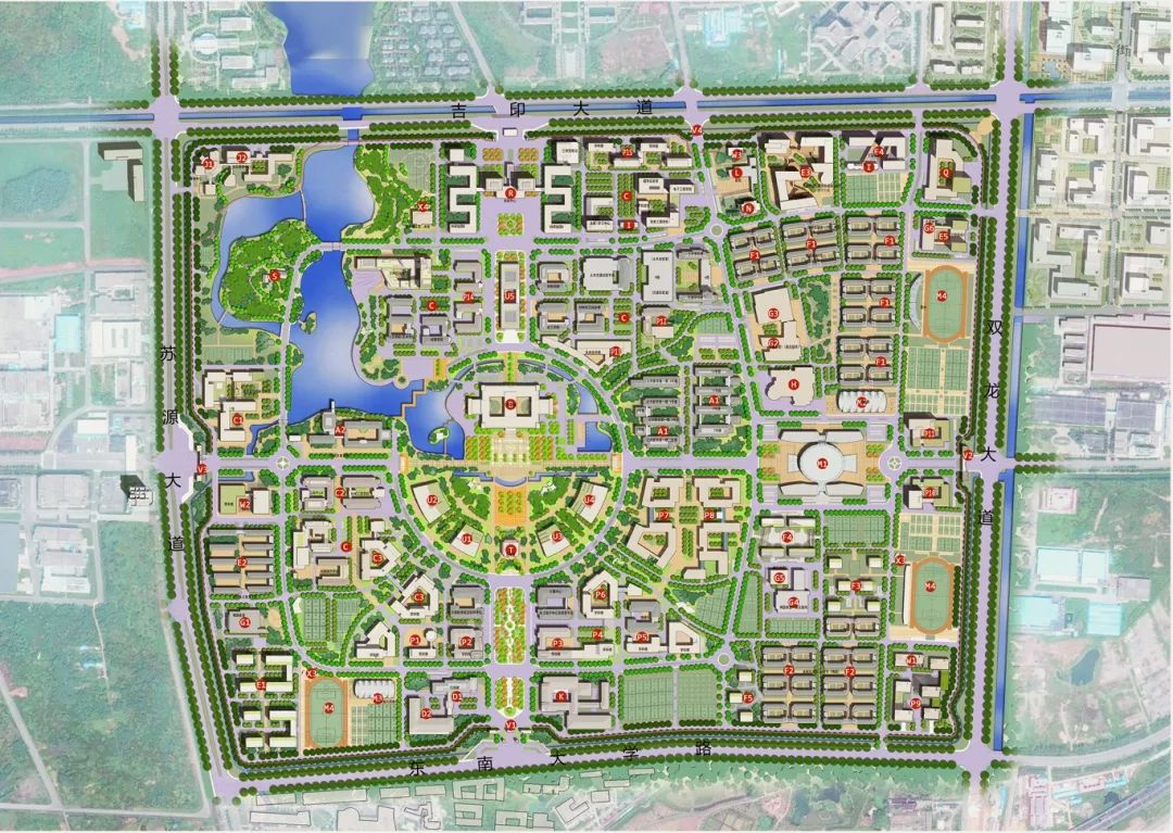 新的规划在调整功能布局、提升校园建筑文化风貌特色、建设绿色智慧型校园的同时,针对发展与土地矛盾,提高了开发强度。总建筑面积较现有规模增加了1倍半之多,达到近252万㎡。
