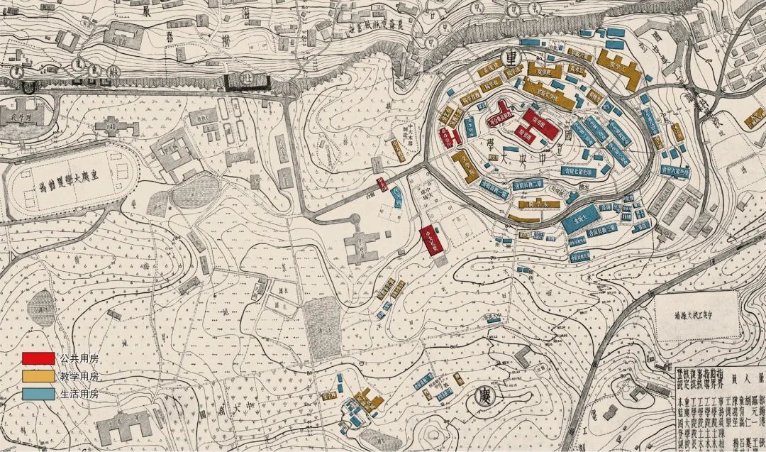 抗战爆发时,日机的四次轰炸给中大校园带来毁灭性破坏。1937年12月,日军陆军医院及“兵头部队”侵驻中大校园,在根据其使用需求改变建筑功能的同时,曾做了见缝插针式的加建:在北区和南区增建了部分简易平房,用作医疗和辅助用途。