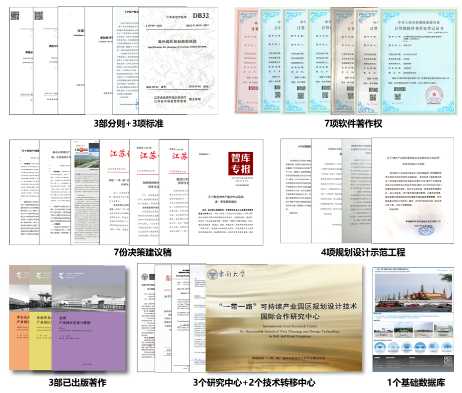 在境外产业园区适应性规划技术研发方面:立足基础研究的相关结论,研究确定了境外产业园区规划编制体系,研发了产业园区空间规划关键分析技术,研制了境外产业园区用地分类与公共服务设施配建核心技术标准等。项目实际研制和发布了3部技术标准和3部技术分则,申报了7项专利、获得7项软件著作权等,回答了境外产业园区规划做什么、如何做等核心技术问题。