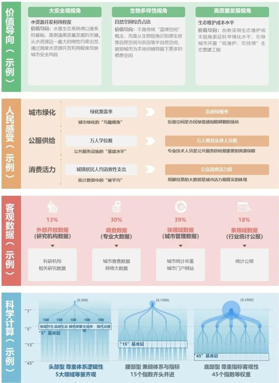 段进教授指出,《指数》不是为了建立一个标新立异的新排名体系,而是希望为中国乃至世界城市的可持续发展提供一套更温和、更包容的新型公共技术产品和系统化、可操作、创新型的解决方案,因而在研究中遵循了“价值导向、人民感受、客观数据、科学计算”的基本原则。1)价值导向不做简单的指标堆砌,而是聚焦时代趋势和新理念的切实落地,从大安全观、生物多样性、高质量发展、文化软实力、城市治理等多种新视角指标反映城市转型发展的需求与成效。2)人民感受重视人民感受、更贴切市民生活,它不再是传统生涩的技术标准,而是成为“让市民看得懂、可感知、能参与”的温度指标。3)客观数据采用不同行业和新技术手段的多元化数据,在数据类型方面遵循城市周期规律,既有体现城市久久为功的用地空间和人口变化数据,又有体现城市当前状态的经济社会发展数据,也有监测城市动态变化的大数据信息。4)科学计算尊重体系的逻辑性,采用“头部型”架构,对“5”大领域进行等量权重分配,引导城市全面均衡发展。