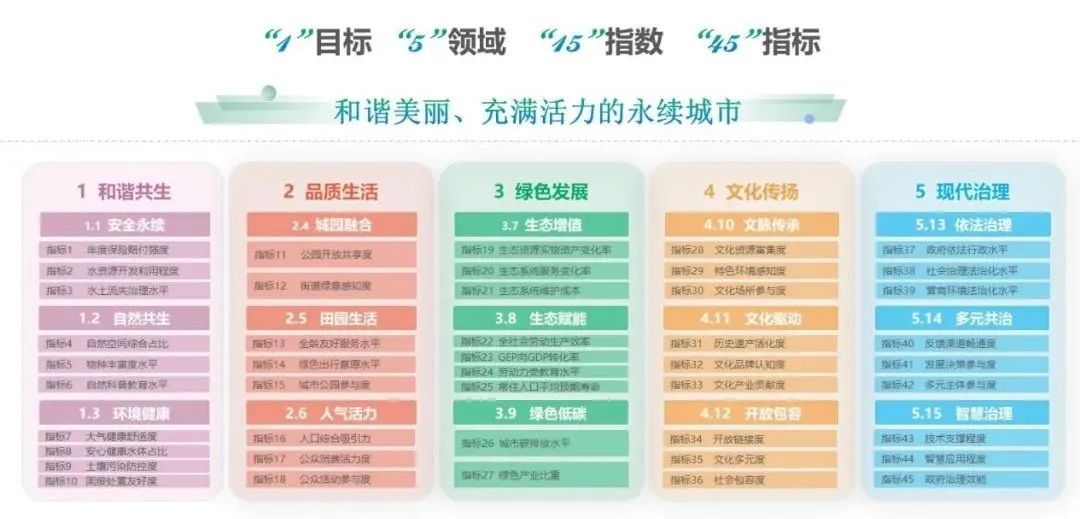 《指数》包括1份总报告和15份专题报告,共计110万字。成果分为“总体目标-重点领域-具体指数”三个层级,可概括为“1-5-15-45”四个方面的核心内容。具体指“1”个目标:“和谐美丽、充满活力的永续城市”;“5”个重点领域:“和谐共生、品质生活、绿色发展、文化传扬、现代治理”;“15”个指数:“安全永续、自然共生、环境健康、城园融合、田园生活、人气活力、生态增值、生态赋能、绿色低碳、文脉传承、文化驱动、开放包容、依法治理、多元共治、智慧治理”;并在此基础上筛选、自定义形成的45个科学可行的测度指标。领域一:和谐共生包括“安全永续、自然共生、环境健康”三个指数方向。“安全永续”聚焦自然灾害、水资源利用、水土流失等城市发展中最关键的大生态大安全问题;“自然共生”以生物视角关注生态空间的规模、结构和质量;“环境健康”突出市民对空气、水、土壤等生活环境的真实感受。领域二:品质生活包括“城园融合、田园生活、人气活力”三个指数方向。“城园融合”关注城市公共空间的开放共享和绿意感知;“田园生活”聚焦引领以公园为中心的生活方式;“人气活力”更关注人的吸引力和城市的活力氛围营造 。领域三:绿色发展包括“生态增值、生态赋能、绿色低碳”三个指数方向。“生态增值” 重视生态资源的系统服务价值以及低维护成本;“生态赋能”侧重衡量生态对产业和人群的赋能价值;“绿色低碳”关注城市的减碳水平和产业的绿色转型。领域四:文化传扬包括“文脉传承、文化驱动、开放包容”三个指数方向。“文脉传承”强调保护、感知并参与传承城市精神内核;“文化驱动”聚焦文化创造性转化与创新性发展,以培育长远发展动力;“开放包容”更关注多元文化交融与文明互学互鉴。领域五:现代治理包括“依法治理、多元共治、智慧治理”三个指数方向。“依法治理”关注法治政府、法治社会、法治市场的指标挑选;“多元共治”侧重衡量参与渠道和参与主体;“智慧治理”突出技术支撑、智慧应用和治理效能。