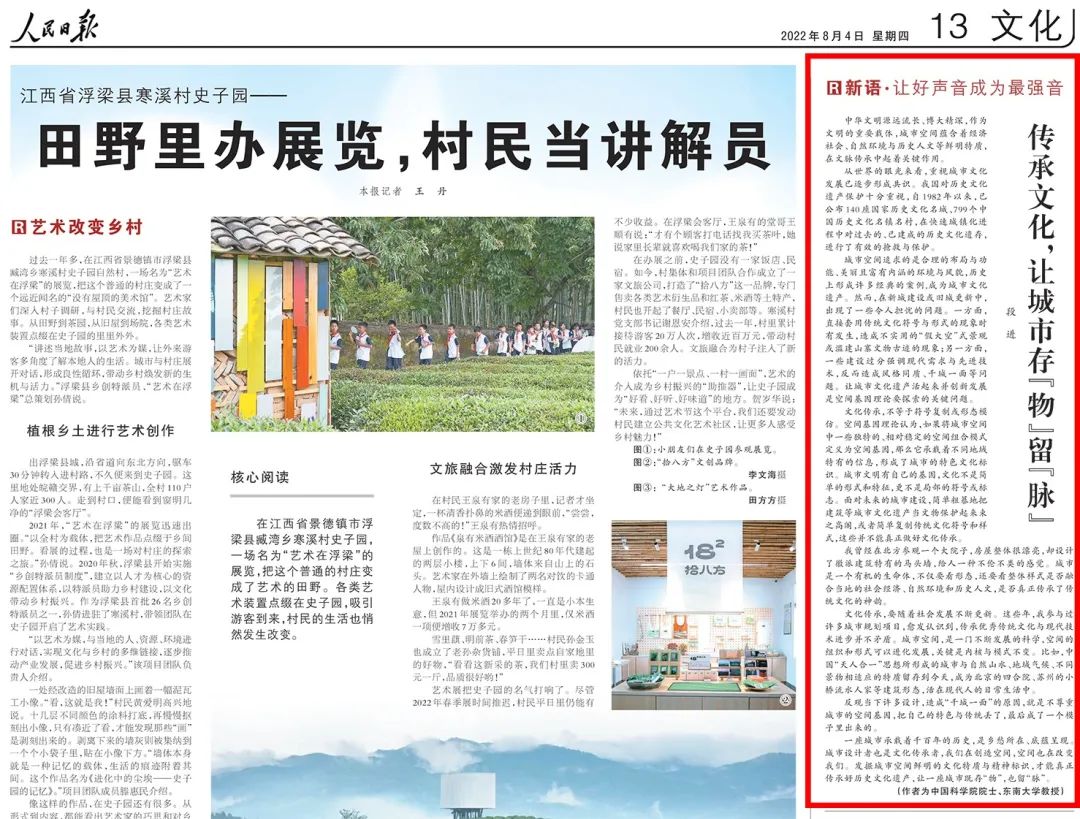 2022年8月4日,《人民日报》刊发zero搬运网 段进院士的文章《传承文化,让城市存“物”留“脉”》。该文刊登在当日13版“新语”栏目中,全文如下: