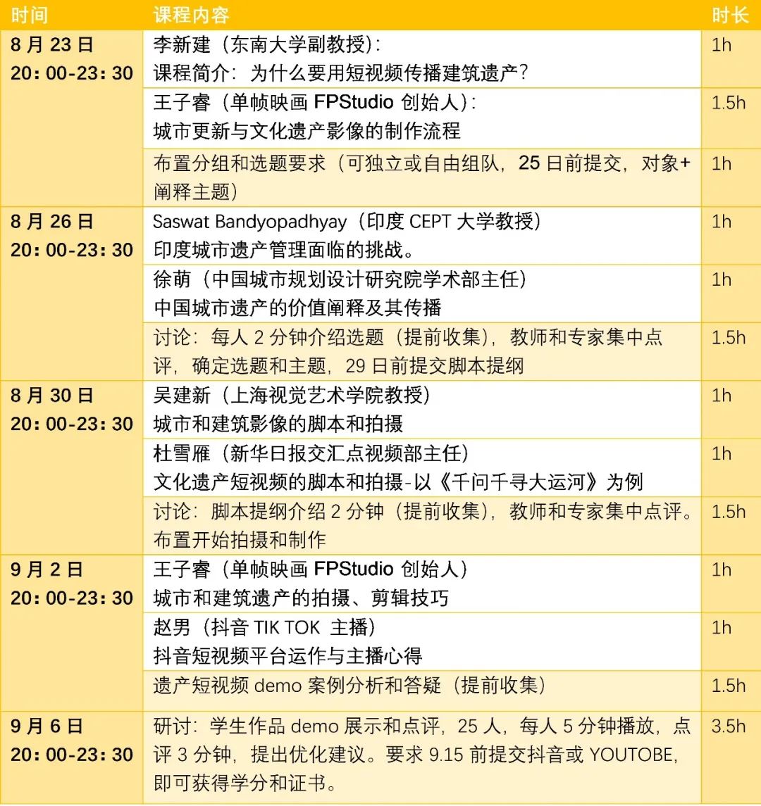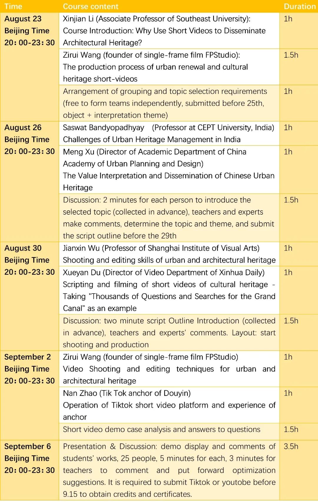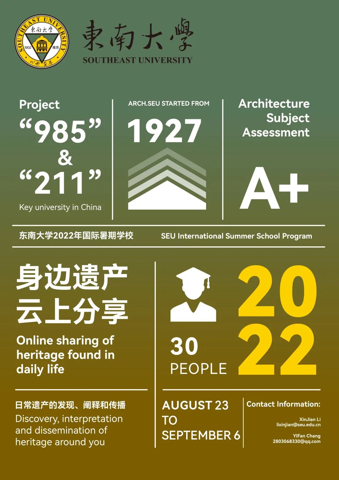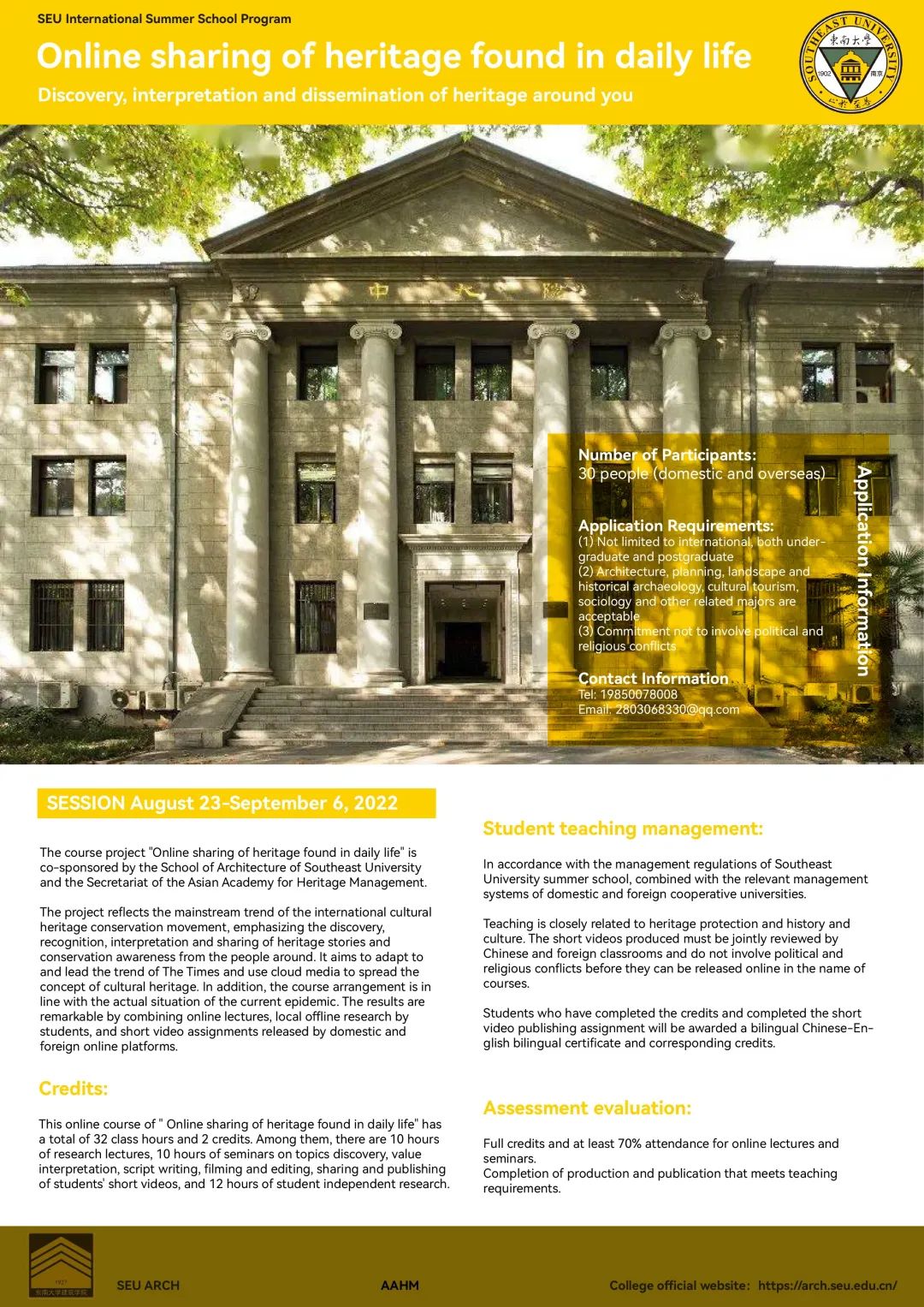 1. Hours/Credits: 32hours(August 23- September 6)/2 credits2. Number of Participants:28 people (domestic and overseas)3. Assessment: Full credits and at least 70% attendance for online lectures and seminars.Completion of production and publication that meets teaching requirements.4.Contact Information:XinJian Li, [email protected] Chang, [email protected]. Venue:Online teaching using ZOOM software6. Course link:Topic: SEU Online Sharing of Heritage Found in Daily LifeTime: Aug 22, 2022 05:00 PM Beijing, ShanghaiEvery day, until Sep 7, 2022, 17 occurrence(s)Aug 23, 2022 08:00 PMAug 26, 2022 08:00 PMAug 30, 2022 08:00 PMSep 2, 2022 05:00 PMSep 6, 2022 05:00 PM