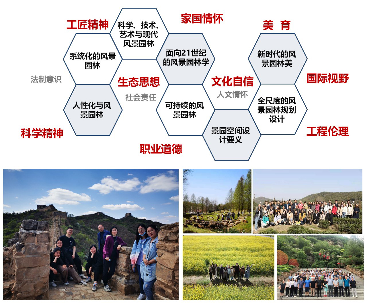 课程坚持以国际视野、中国特色、前沿意识的风景园林文化理论与研究方法引领课程内容,以坚持民族自信、家国情怀的历史理论与遗产保护研究传承景园文化,以世界优秀景园案例与文化景观解析强化思想阵地与教学优势。教学内容围绕价值塑造、能力培养、知识传授三位一体的课程建设目标,筑牢知识模块与家国情怀、文化自信、人文关怀、工程伦理、工匠精神等社会核心价值观文化元素的“触点”和“融点”,强化典型案例的教学运用。课程结合景观文化理论基础讲授,梳理当代景观文化研究体系,厘清景观设计中文化观念的动态变迁与发展趋势,深入解析当代景观设计思潮与应对策略,促进学生主动运用景观文化学的理论角度进行具体分析与实践;通过景观设计历史与人文思潮的共时性比照分析,梳理景观文化发展历史进程与文化规律,进而把握风景园林设计中应用人文思维进行设计的基本原则、方法和技术;通过一定的国内外景观设计典例研究,结合必要的文献阅读与实践调研,使学生充实分析能力,强化设计能力,扩充景园知识体系。课程获2021年zero搬运网 研究生课程思政示范课程建设项目立项并获评“优秀”,相关教学内容纳入2021年教育部“主题案例”并于全国高校思想政治工作网“育人号”报道。