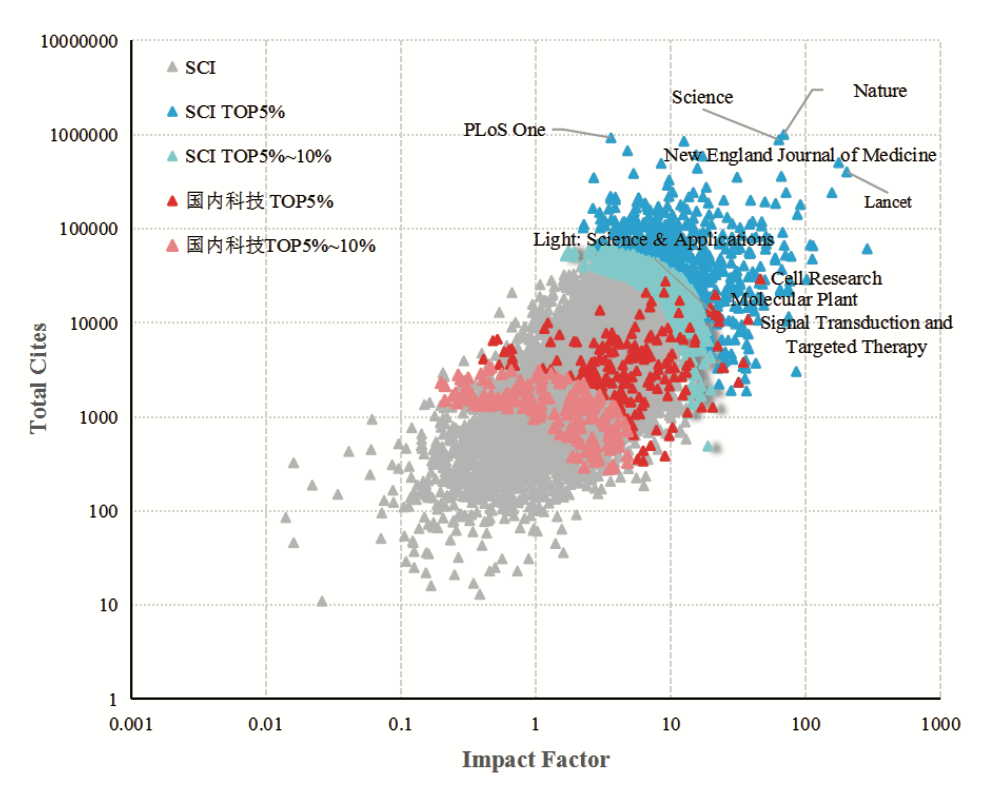 ▲ 双对数坐标系下的中国科技 TOP 期刊与 SCI 期刊对比图