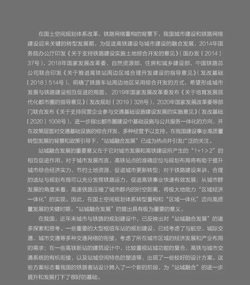 《中国“站城融合发展”研究丛书》共四册,分别是《站城融合之综合规划》《站城融合之城市交通衔接规划》《站城融合之城市设计》和《站城融合之铁路客站建筑设计》。丛书汇聚了多位院士与众多专家对于中国站城融合发展的深入思考与最新探索,相信本丛书一定会对推动我国下一阶段的站城融合发展提供重要的战略指引与思想借鉴。