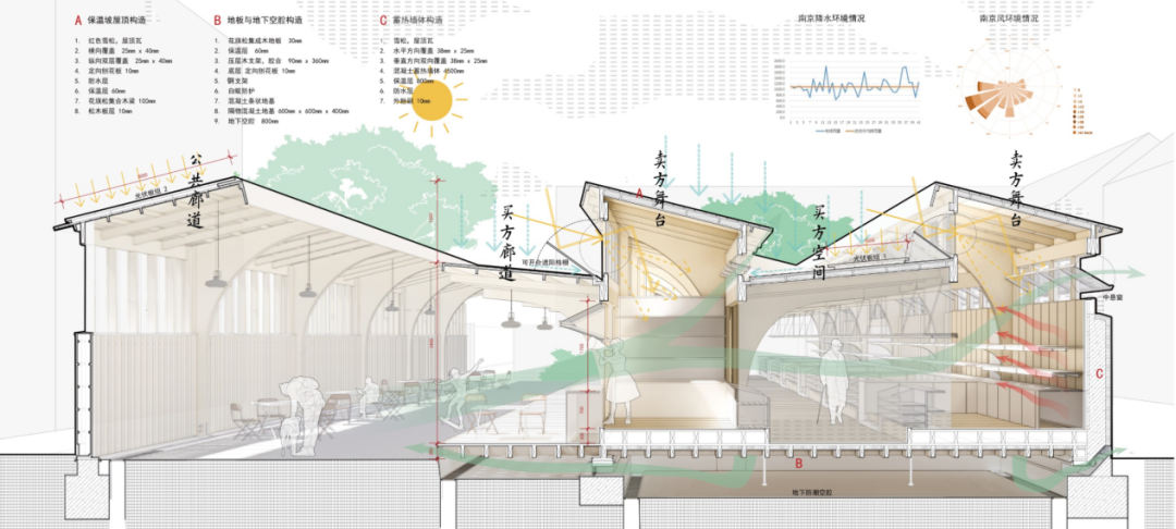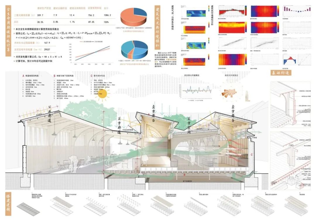 1)设计作品以木构与绿色建筑设计出发,对应买与卖的行为,两种不同的空间被塑造与并置:卖方空间净空较高,木构的十字双柱起到空间限定的作用,围合出一个正方形售卖区,配合顶部洒下的光线,形成戏剧舞台般的展示效果;买方空间环绕在周围,净高降至3.5米,转变为一个较为亲人的尺度。2)设计将核心构建为两种十字拱形木柱,完成不同的空间需求,以柱型的变化来适应建筑的通风采光需求,做到雨水回流利用。3)建筑同时使用多种被动式设计,保留建筑原有的部分混凝土墙体作为蓄热体,也对建筑的全生命周期的碳排放问题进行计算,以低碳作为建筑设计的指导。