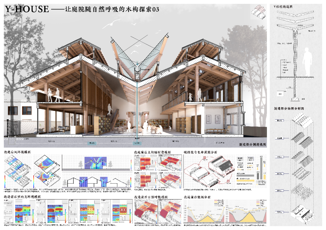 1) 设计将原建筑内改建加建部分拆除,保留了建筑原结构和场地内原有三棵树; 通过重新划分空间并增设老虎窗,改善居住环境; 东侧新建建筑为居民提供阅览、休憩空间,采用CLT木结构重新诠释木结构建筑,保留历史建筑特色;原建筑与新建建筑庭院均设Y型柱形成优质庭院公共活动空间,呈现历史风貌的和谐统一。2) 设计对空调外机进行处理,引导排风。Y型庭院充分配合空调外机,冬季形成阳光温室,夏季形成拔风效应,改善庭院风环境; 采用冷屋顶反射太阳辐射,减少建筑得热,相比传统屋顶,可节约高达40%的能耗,延长屋顶使用寿命,减少维护成本,并采用双层屋顶促进室内采光通风,防止水渗入建筑物内部; 在新建建筑部分安装太阳能储电设备,使旧建筑成为旧建筑的“充电宝”,实现建筑零能耗设计。