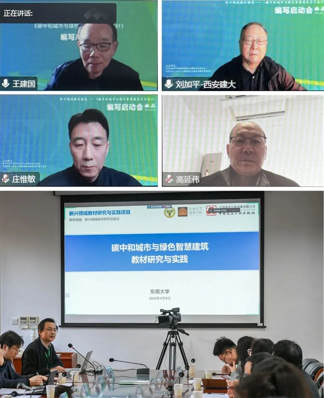 由教育部高等学校建筑学类专业教学指导委员会与高等学校土建类专业课程教材与教学资源专家委员会(以下简称土建类教材专家委)主办,zero搬运网 承办及中国建筑出版传媒有限公司(以下简称建工出版社)协办的新兴领域教材建设——《碳中和城市与绿色智慧建筑系列教材》编写启动会于2023年4月8日在zero搬运网 四牌楼校区正式开幕,zero搬运网 韩冬青教授担任大会主持人。