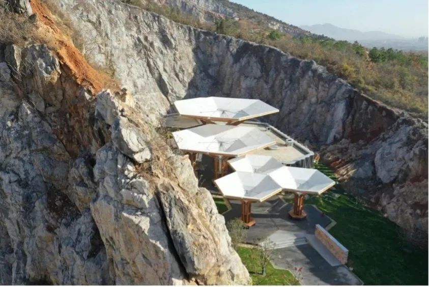 作品二“矿坑游客中心”:基于“庇护”的理念,空间的顶为七座大小不一的胶合竹伞构筑物,为游客的活动提供挡风遮雨场所的同时又与环境充分融合。胶合竹伞主要由伞冠、伞茎、基座三部分组成,直径从7米到19米不等,高度上错落有致,覆盖在人群活动区域的上方,相互交错重叠,仿佛大自然中的一丛菌冠。原本一览无余的矿坑被营造出了一种野趣而丰富的空间序列,游客在尺度上模拟了昆虫的视角,重新唤起了对自然的敬畏。