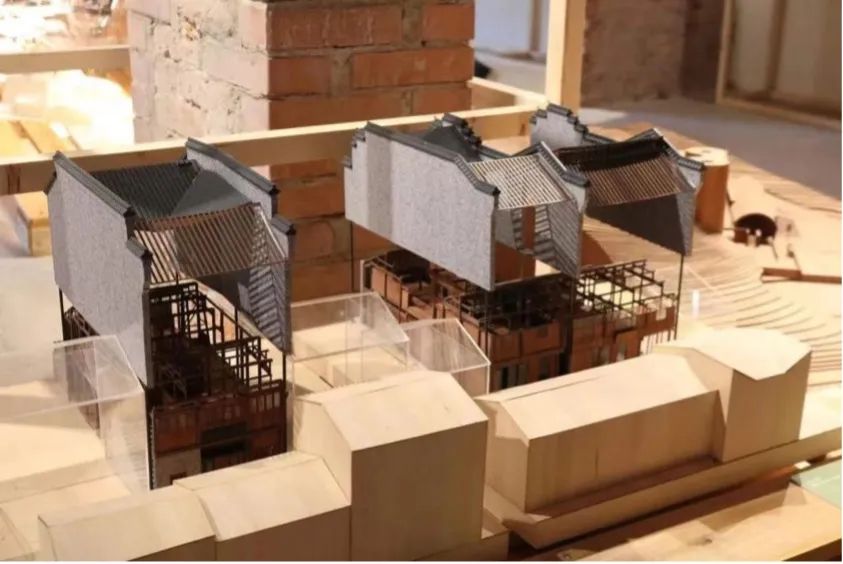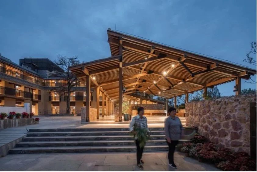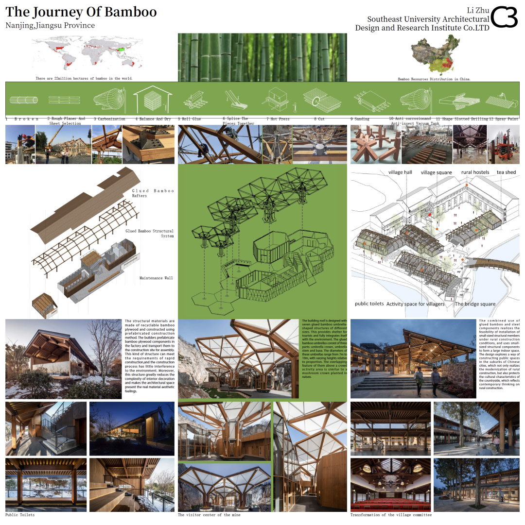 作品三“乡村公共空间复兴”:项目将原有村委三层办公楼进行改扩建,形成乡村旅舍的客房,围合出的内院保留了原场所记忆,成为村民和游客日常活动的乡村小广场。胶合竹材与钢构件的组合运用,实现了小尺寸结构杆件在乡村建设条件下的安装可实施性,并利用小尺寸结构构件形成室内大空间以供村民和游客使用。设计探索了在中国城市近郊乡村中既实现了乡村建设的现代化、又不抹杀乡村的文化特征的公共空间营造方式。