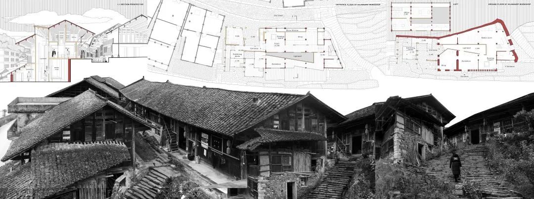 两河口,一个建于19世纪的土家村寨,因其典型的干欄木构建造体系,具有应对环境与功能变化的自适应与拓扑再生机制,使其在将近200年的社会变迁中得以存留并一直显现活力。作品通过村口民宅改造为西兰卡普织锦工坊,探究这一机制在当今城乡激变中的有效路径。
