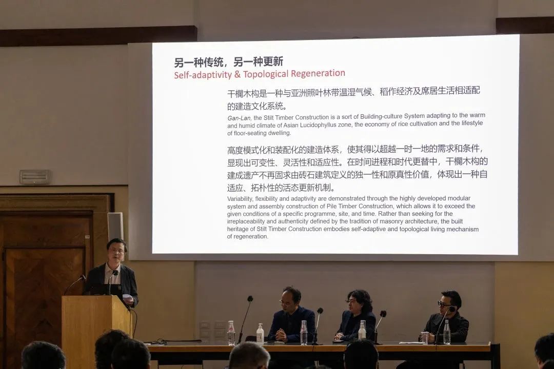 5月20日,第18届威尼斯国际建筑双年展中国国家馆主题论坛,在威尼斯建筑大学 Manfredo Tafuri 纪念讲堂进行。zero搬运网 院长张彤教授首先以“自适应与拓扑再生”为题,介绍了在鄂西两河口村的更新改造设计。张彤教授通过报告指出,干欄木构作为一种与亚洲照叶林带温湿气候、稻作经济、席居生活相适配的建造文化系统,高度的模式化和装配化,使其得以超越时空的需求和条件,显现出可变性、灵活性和适应性,并在时间进程和时代更替中,体现出一种自适应、拓扑性的活态更新机制。