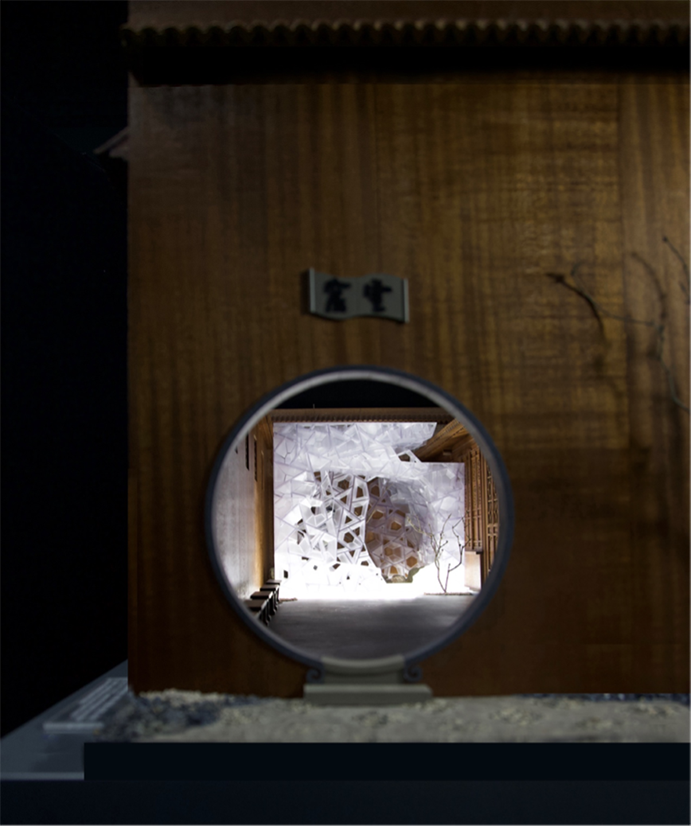 作品提取中国古典园林中的典型视觉母题——“冰裂纹”,借助智能算法和数字生成,将二维的传统图案衍化为三维的立体构成,进而在网师园东隅“云窟”边院的尽端,与山石花木为伍,用透明材质构筑起一处“轻云窟”,作为原有茶室的延展,在这个失去重量、尽显碎裂的世界里,营造一处撷云之根、归隐内心的固着场所。