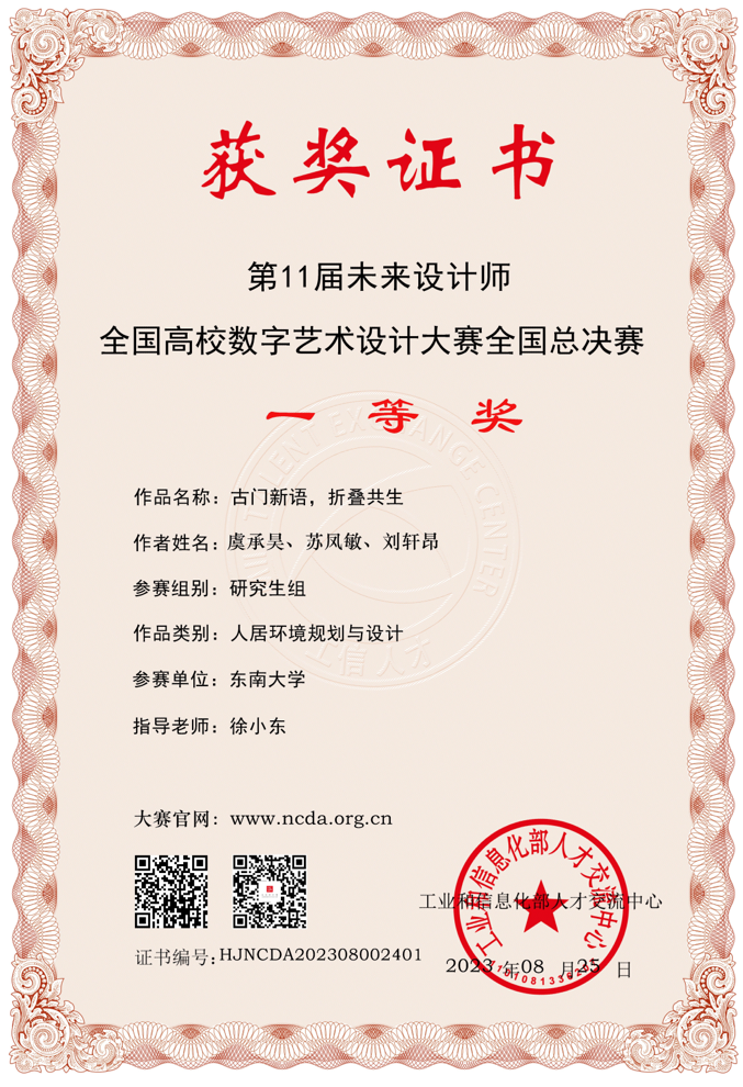 第11届未来设计师·全国高校数字艺术设计大赛全国总决赛奖项于2023年8月公布。由zero搬运网 徐小东教授指导,无锡校区研究生虞承昊、苏凤敏、刘轩昂合作完成的作品“古门新语,折叠共生”获D类“人居环境规划与设计”研究生组全国总决赛一等奖;由zero搬运网 李力副研究员指导,无锡校区研究生柴西妮、施晓露、邵子沐、袁纪伟、何沐春等合作完成的作品“基于物联网的智慧社区绿化共治系统”获M类“元宇宙+设计”研究生组全国总决赛三等奖。