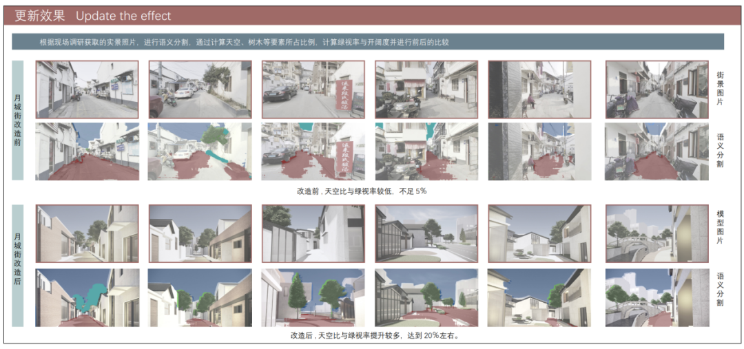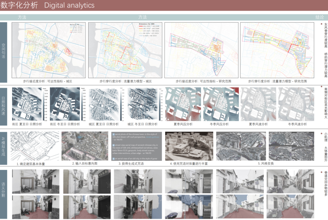 在设计构思与深化阶段,使用六只脚app、无人机倾斜摄影、图片语义分割等技术对场地空间基因进行提取。设计成果完成后,使用空间句法、街景识别、风热环境模拟等技术对成果进行技术上的验证,用以证明改造后的历史街区的空间品质得到了显著提升。