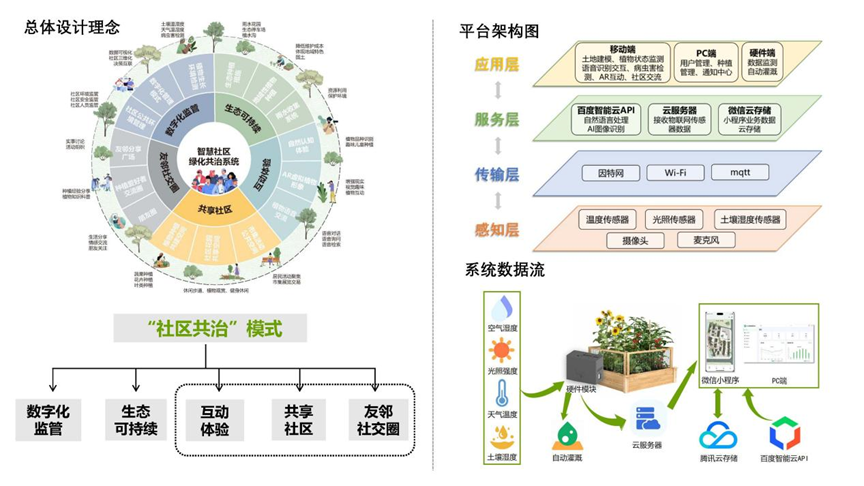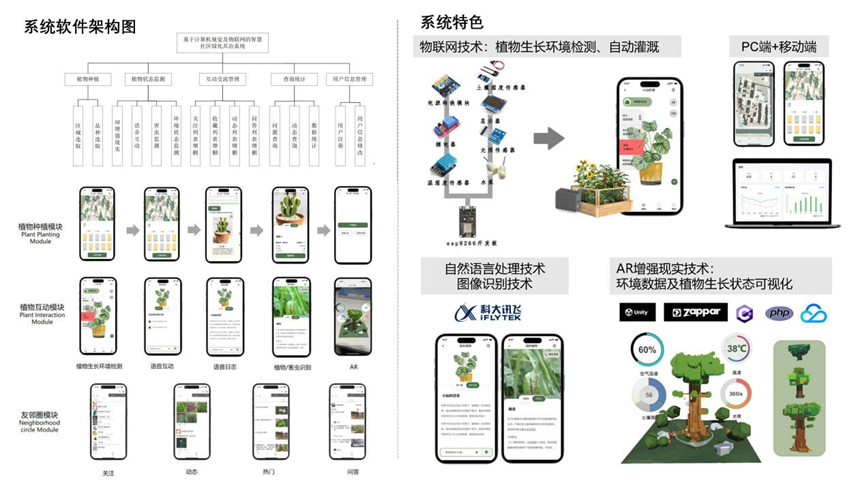 “基于物联网的智慧社区绿化共治系统”团队对无锡市梁溪区老旧社区绿化展开现场勘测,总结出“自上而下”的绿化管理模式已满足不了现代居民生活的需求,社区绿化亟需改造和提升。团队提出以引导居民参与社区共治为出发点,以改善老旧社区绿化为着力点,以提升居民生活品质为落脚点,构建一套智慧社区绿化的共治系统,作为当下推广社区共治模式,社会多元群体参与社区建设实践的技术支撑。方案重点针对居民种植活动,整体架构采用物联网技术,在软件层面上设计了用户微信小程序移动端和管理员PC端,融入了自然语言处理、图像识别和AR增强现实技术;在硬件层面上,配置了植物生长数据检测系统辅助居民种植,来保障社区共治绿化的品质。