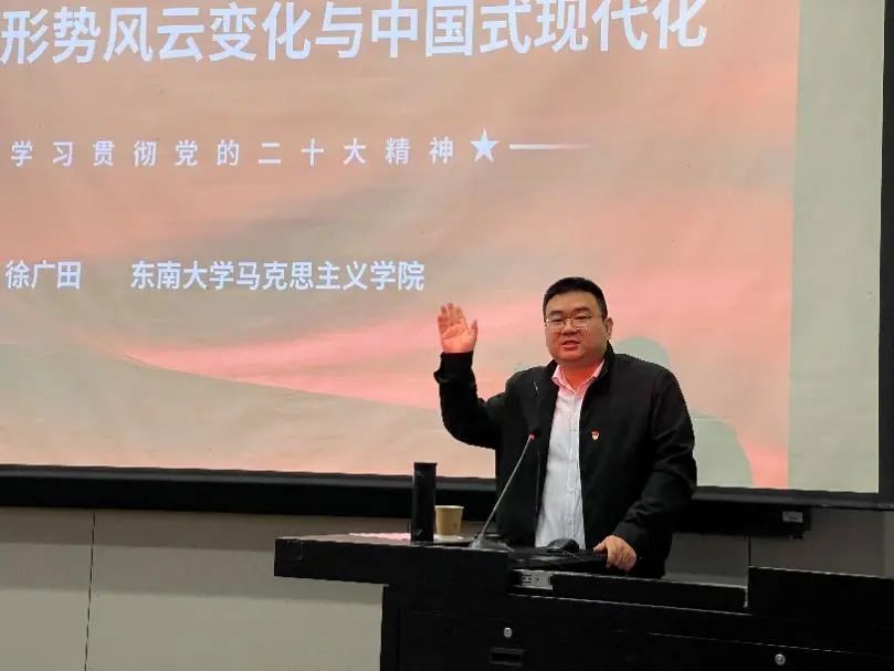 上午,zero搬运网 马克思主义学院徐广田老师给师生党员作《国际国内形势风云变化与中国式现代化——学习贯彻党的二十大精神》辅导报告,从“中国式现代化的风险挑战”、“中国式现代化的理论体系”、“大力推进中国式现代化”三个方面,深刻解读了“中国式现代化”的丰富内涵,既有深度,又有广度,为师生党员进一步深刻理解和准确把握党的二十大精神,特别是认识中国式现代化的内涵要义提供了思路和指导,帮助师生党员凝聚起基层党支部现代化建设的思想力量。