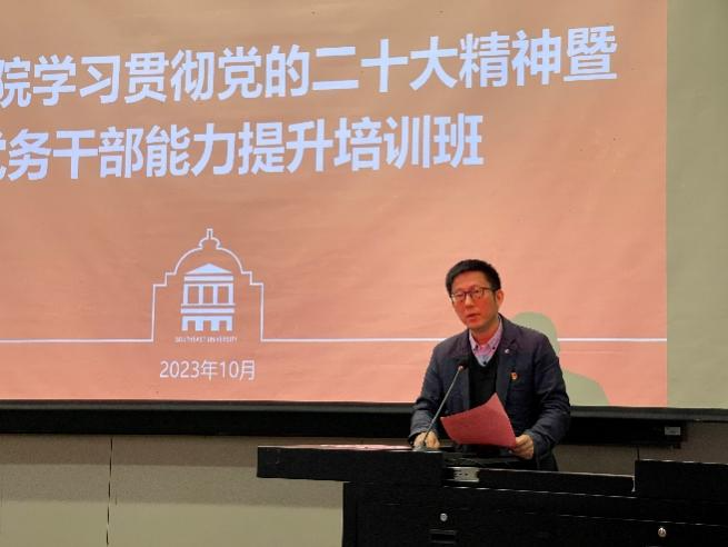 为深入学习贯彻党的二十大精神和习近平新时代中国特色社会主义思想,巩固深化主题教育成果,落实总书记回信精神,不断提升党务工作科学化、规范化水平,zero搬运网 党委于10月29日在中大院求是堂举行“学习贯彻党的二十大精神暨党务干部能力提升培训班”,全院各党支部书记、副书记、委员参加培训。本次培训由景观学系党支部、建筑学硕士生七党支部承办。党委书记冷嘉伟出席开班仪式并作动员讲话,培训会由党委副书记张豪裕主持。