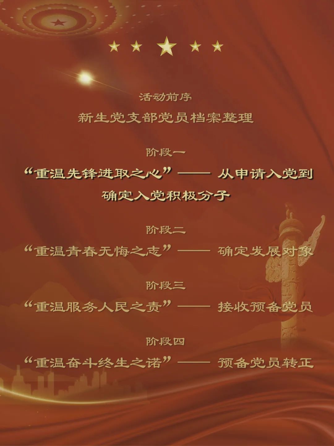 本阶段活动在梳理该阶段发展工作内容的同时,组织优秀党课学习,开展“重温入党申请书”活动。以活动的形式引导各党支部支部委员熟悉党员发展流程,引领党员同志重温入党光辉时刻,牢记入党初心,汲取奋进力量,以新姿态从容主动、更加积极地践行党员义务,履行党员责任。