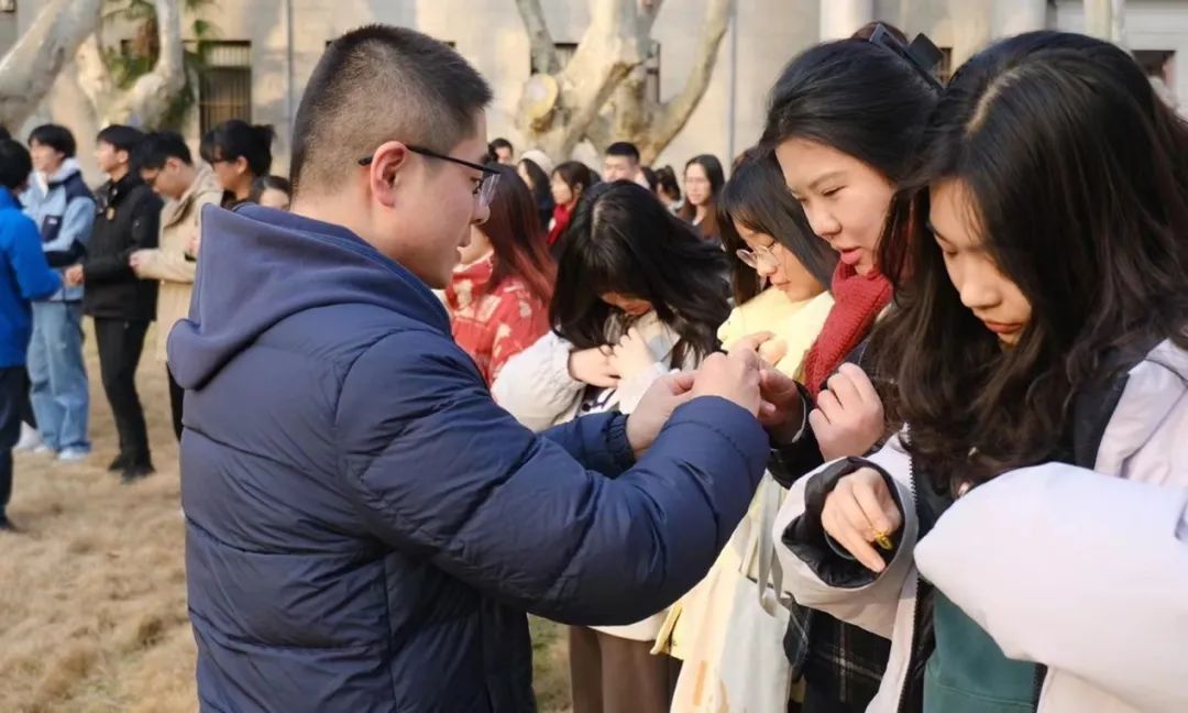 随后,师生一行移步中大院面前的大草坪,并分为五排站队,新发展党员站在队伍的最前列。仲德崑老师、张豪裕老师、曹俊老师、奚月林老师分别为近期19位新发展党员佩戴党徽,这是对新发展党员的肯定和鼓励,勉励他们坚定信念,不忘初心,牢记使命,不断学习和进步,以新姿态从容主动、更加积极地践行党员义务,履行党员责任。