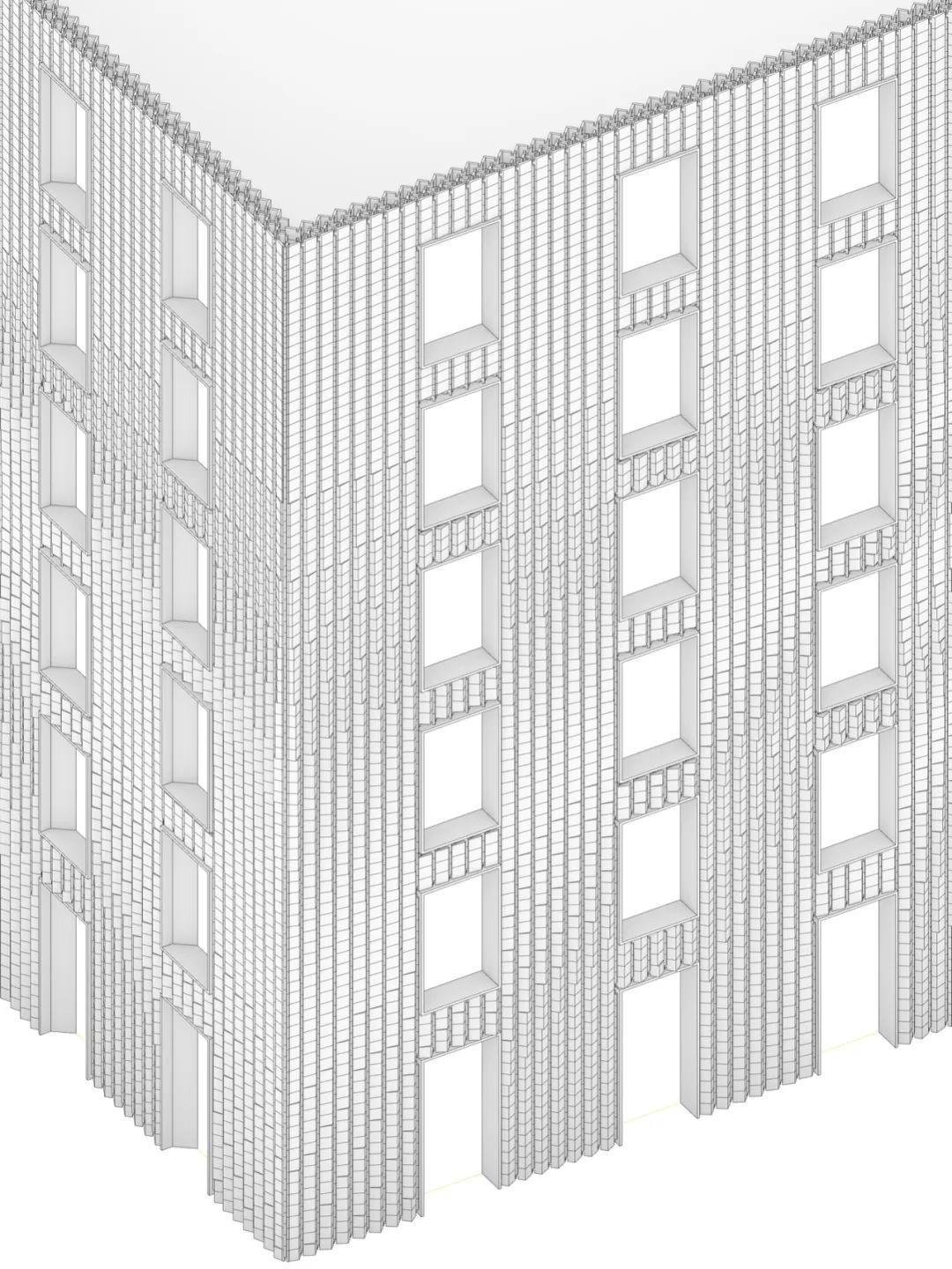 利用砌块外侧的几何自由度,在整个建筑立面上形成流动式的正弦曲线图案。采用参数化的建模方式对建筑的所有砌块进行批量化建模,并输出机器人线切割路径,实现批量化的定制生产。