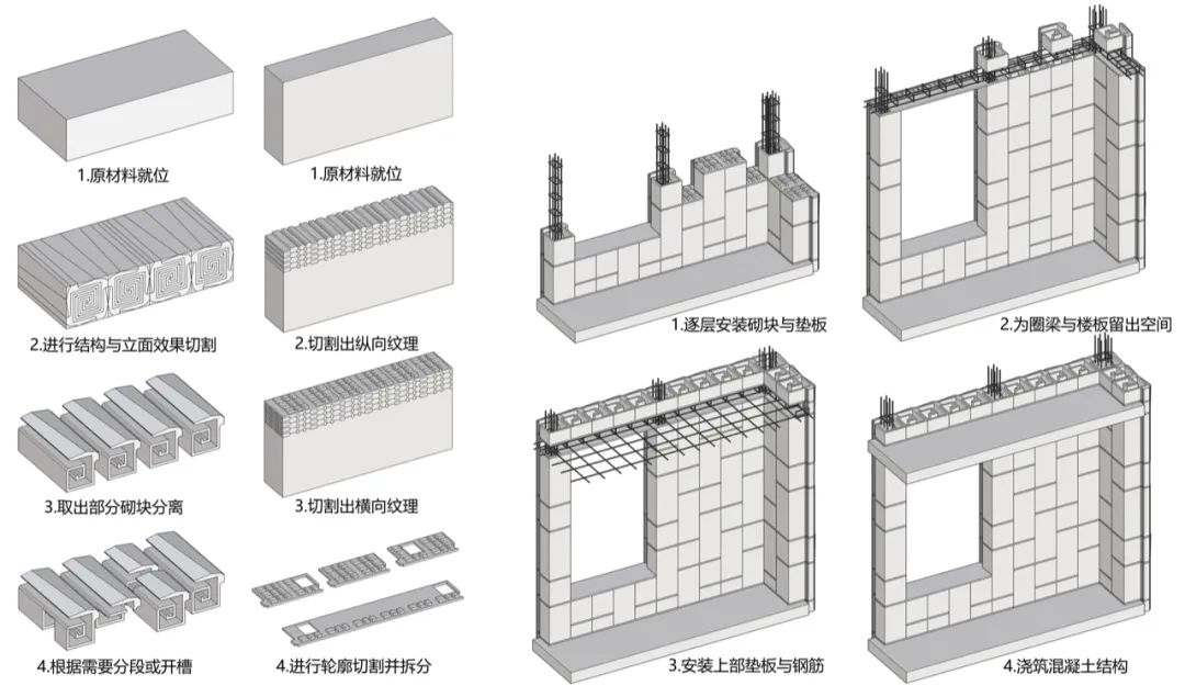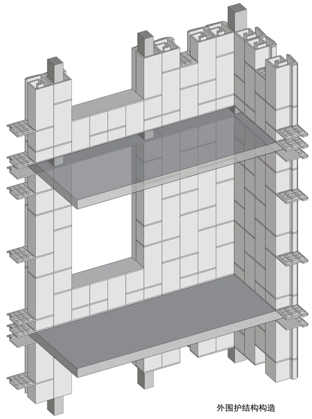 定制化的横板增强了砌块之间的垂直与水平连接。一长一短的砌块组合(立面上呈L形)与横板共同构成了一个弱互锁体系,有利于干砌式结构的稳定性。部分砌块内部留出用于浇筑构造柱的空间。另一部分砌块水平切割出凹槽,与横板一同组成圈梁模板。转角处为正方形截面的特殊砌块,适应两个方向墙面的厚度。