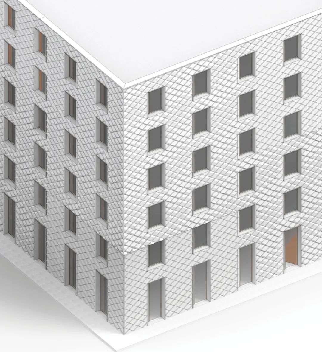 受到十七世纪末Abeille平拱的启发,本项目研究了互锁砌块的几何特征与拓扑互锁原理。从彼此互锁、隔断空间、空腔保温3项要求出发,团队发现正多边形的各种变体能难满足外围护结构的需求,进而提出了一种双层互锁结构,内外层之间引入了联系构件,以加强稳定性并分割空腔。为了简化砌块种类与制造复杂度,合并了内部联系构件和表面互锁砌块,最终形成一种新颖的斜三向正交结构。