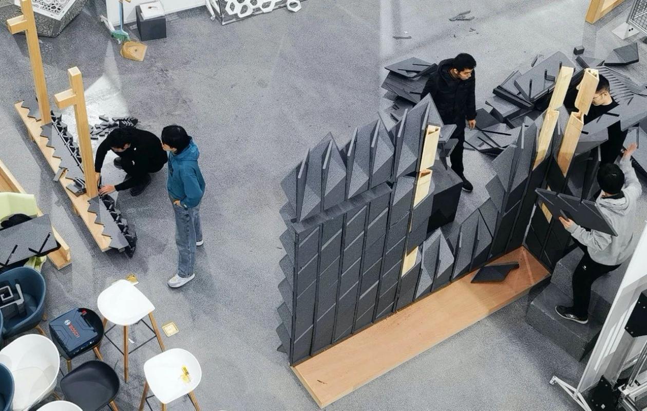 在墙厚度方向增加折板数量,形成空隙,也加强了整体结构稳定性。利用多层穿插的几何特征,形成转角处构造。为了造就多个互不贯通的内部空腔,增设了水平隔板构件,隔断既有的竖向贯通空腔。