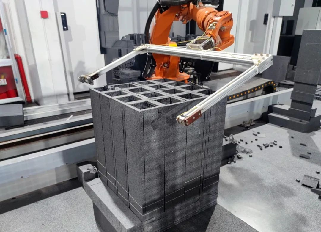 对3类砌块及其子类型(共21种)进行参数化建模,并密排在1.2*1.2*2.4m原材料方块中,以便于批量化线切割并使剩余的边角料最少。使用6轴工业机器人及其变位机实现各种不规则砌块的自动化制造。