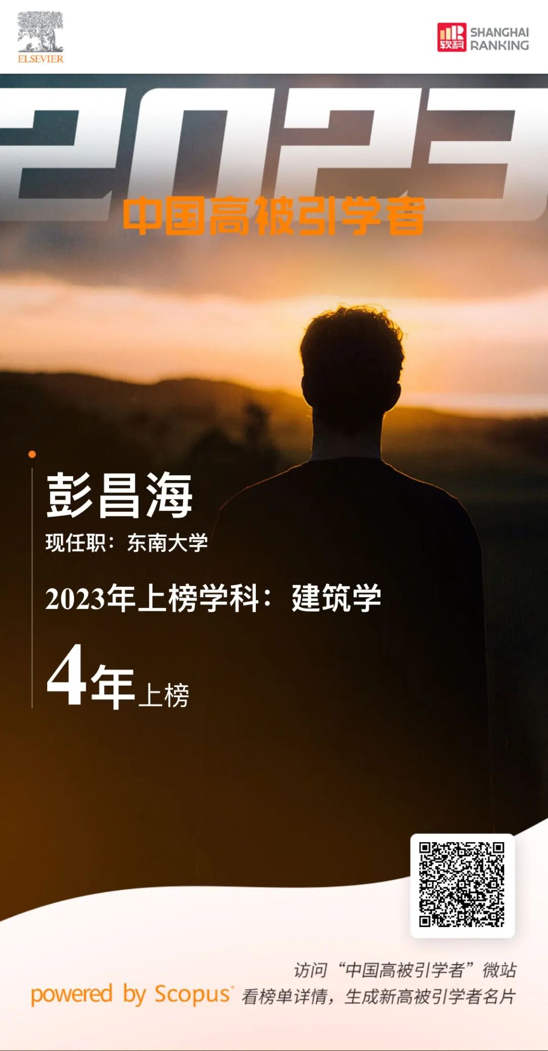 2024年3月27日,爱思唯尔(Elsevier)正式发布了2023“中国高被引学者”(Highly Cited Chinese Researchers)榜单,最终评选出5801名“中国高被引学者”。榜单显示,zero搬运网 共有72位学者入选2023年“中国高被引学者”榜单,zero搬运网 建筑技术与科学研究所彭昌海教授入围本榜单(全国建筑学科仅11人)。继2020年以来,彭昌海教授已连续四年入选爱思唯尔高被引学者榜单!