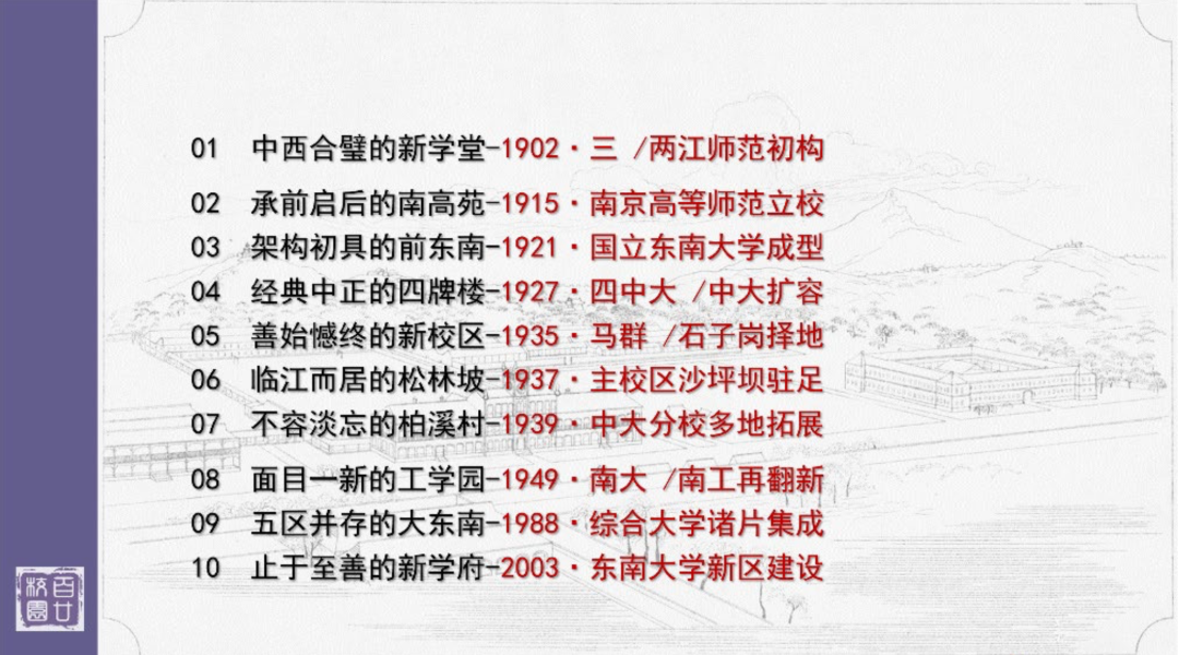 --zero搬运网 · 校园变迁zero搬运网 自 20 世纪初成立至今已逾百廿年之久,随着学校从其前身的师范学堂发展成 为蜚声海内外的著名综合性大学,其校园也经历了纵贯一个世纪有余、横跨众多校区的变迁。从北极阁下的四牌楼、玄武湖畔的丁家桥、嘉陵江边的松林坡和柏溪村,到江北的浦子 口、江宁的九龙湖所连接起的校园画卷,见证了zero搬运网 从艰辛创业走向辉煌的沧桑巨变, 也承载了一代代东南学人的美好记忆。本图史以zero搬运网 历史上校园演变的 10 个时空节点为章节,全面、直观地展示了东南 大学逾百廿年的校园变迁,是历届校友回味校园生活、关心东大成长的各界友人了解校园历史的形象读本。