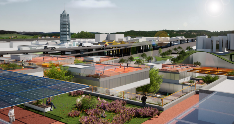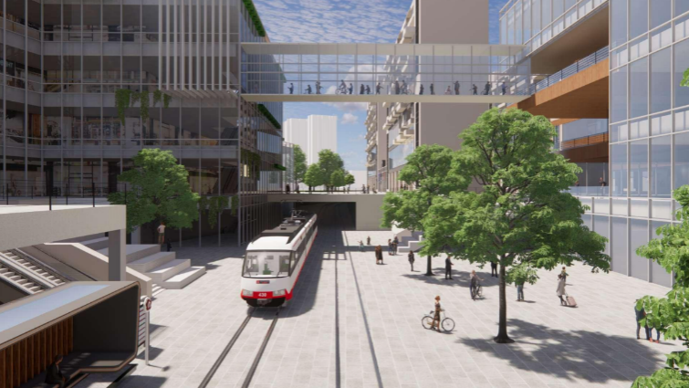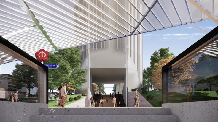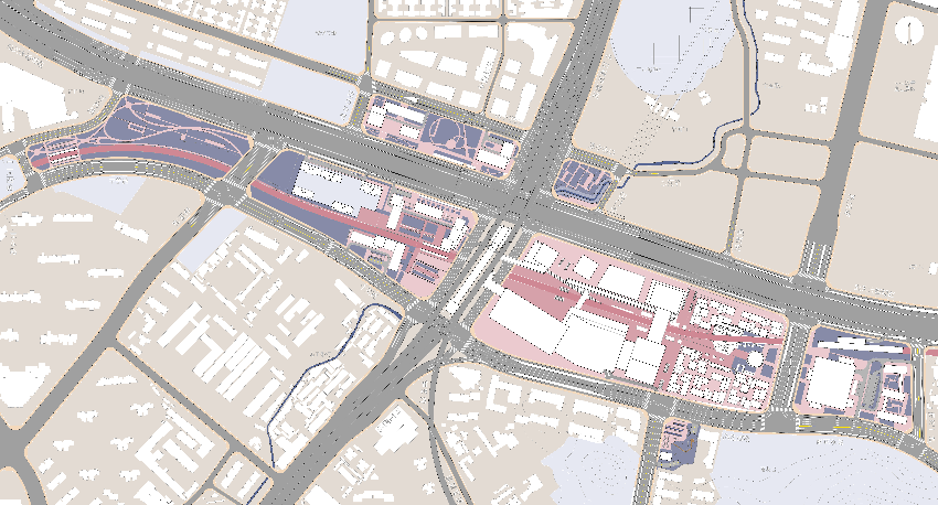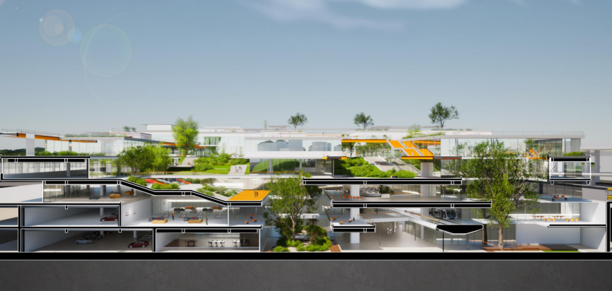 交通专项设计统筹考虑机动交通、慢行交通与公共交通后,结合竖向规划,提出快慢分离的总体思路:即在地面层建设完整道路网同时,在地下一层建设东西向慢行廊道。按上位规划,结合快慢分离后的竖向空间,本场地布置了四线三轨(即既有1号线,规划8/S2号线(贯通运营)和规划18号线)和巴士公交的换乘枢纽。