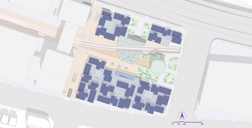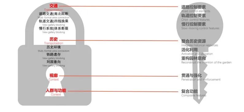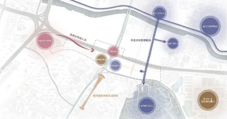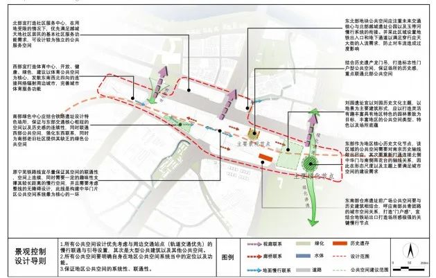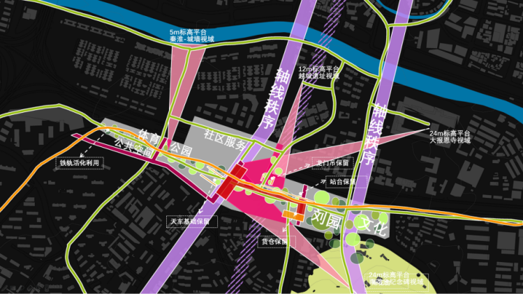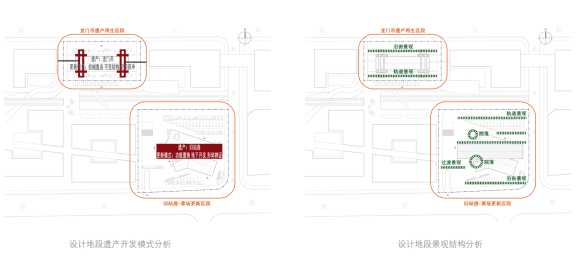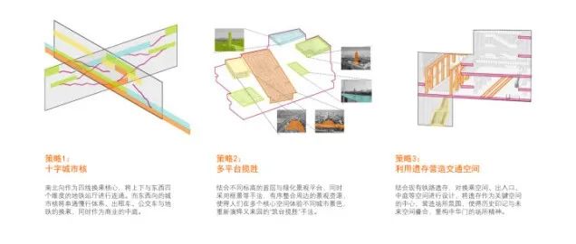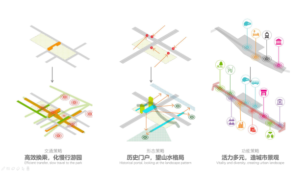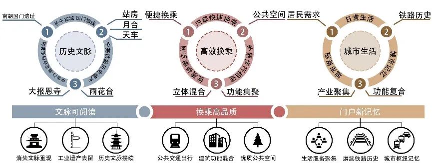面对不同历史时期层叠在同一场地的物质遗存,和当代城市快速高效的机动与公共交通需求,本次总体城市设计提出古今门户,枢纽重启的设计纲领。我们希望场地既是城市总体层面上风貌展示的门户,也是历史遗产与当代新增开发项目近距离接触,展示历史交汇的“门户”。以历史轴线上文脉节点和公共交通刚性功能及居民生活场所的交汇门户为总体定位,本次设计提出文脉可阅读、换乘高品质,门户新记忆的战略,以期实现历史结构存续、物质遗存参与场所营造的遗产保护目标;内部快、外部连、过程有序的交通目标;以及赓续铁路站点历史,塑造城市枢纽记忆的公共记忆目标。