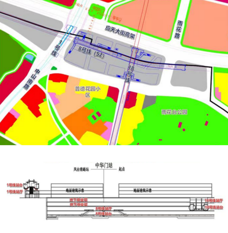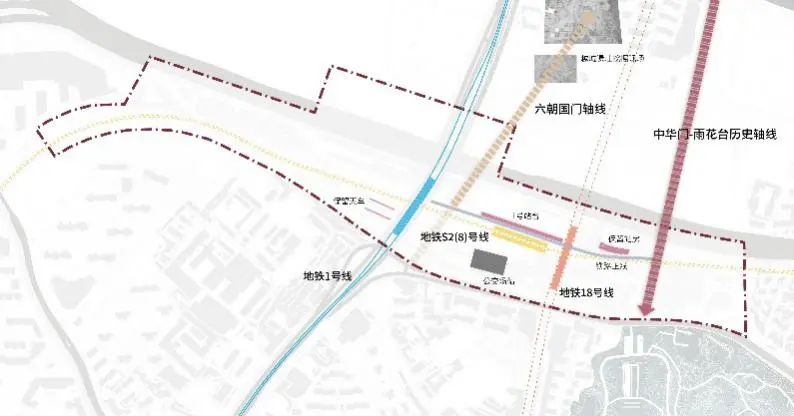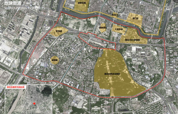 场地:中华门站位于南京市雨花台区应天大街与中山南路、雨花西路交叉路口南侧高架中间,是南京地铁1号线的车站,为路中高架三层岛式车站。其中,中华门火车站为正在运行中的宁芜铁路客货运站,未来将改造为地下轨道8号线。用地周边有南京老城住区、雨花台烈士陵园等,还有越城遗址、大报恩寺等城市历史遗迹。随着南京老城南复兴计划的逐步实施,中华门周边区域也处于快速发展时期,中华门节点地区成为南京历史文化名城风貌的重点展示地段及南京未来旅游、休闲、文化娱乐活动的主要承载区。