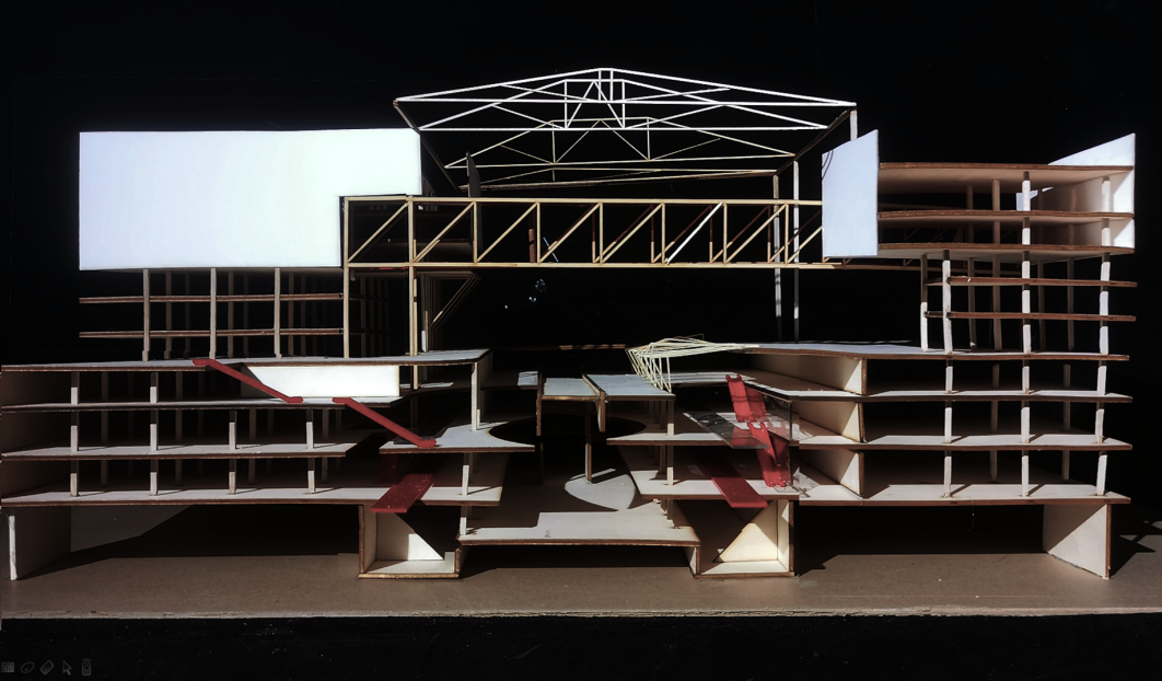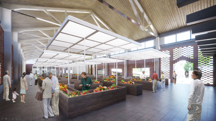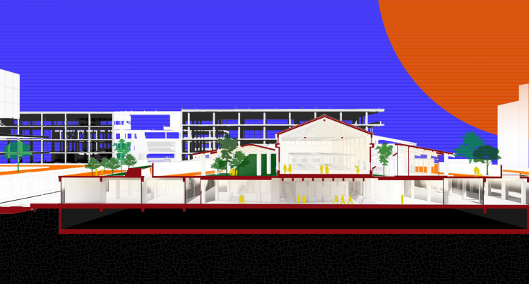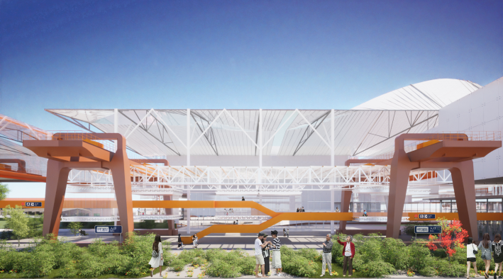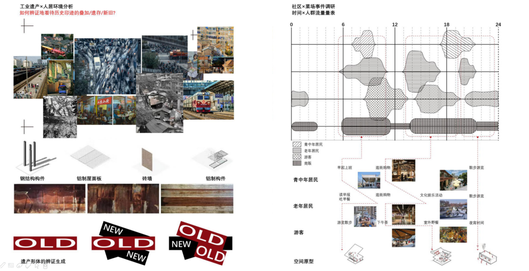 工业遗存更新再生地段选取旧站房、龙门吊及其所处区段TOD营建和人居环境为研究设计对象,一方面以现代性和发展的视角,辨证看待历史印迹的新旧、叠加或迭代,另一方面根据场地的人群活动时间提出事件构想,从而推导出旧站房改造为菜场,龙门吊更新成创意工坊的设计概念。对于旧站房,更新的态度是功能置换兼顾地下开发,并以辨证的形体、戏剧性的空间演绎回应对新旧的思考。旧有结构中承担菜场功能,服务TOD流线和社区人群;新结构则纳入具有流动性和即时性的坡地集市,带动新旧场所的转换。龙门吊的更新模式为重启机械功能,利用可变结构多次定义空间,并以富于活力的姿态向外部介入TOD和市民活动。