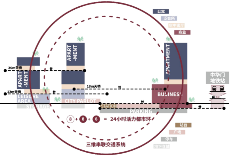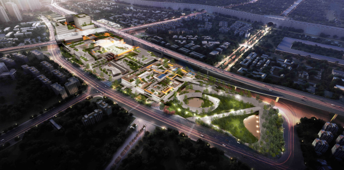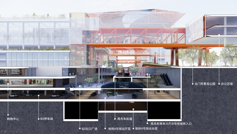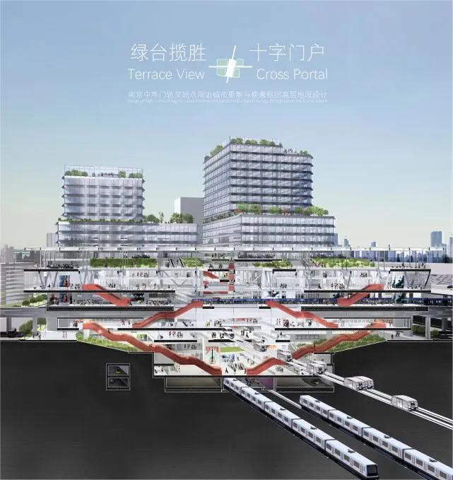换乘枢纽高层地段深化设计从复杂交通换乘、景观视线整合以及遗存利用三个核心问题入手,提出十字城市核、多平台揽胜和遗存塑造空间等作为设计策略,引入商业、办公、居住、文化等多类功能。在十字城市核中,通过对不同标高的平台进行梳理,构建高效的轨交、车行、公交、慢行等多类交通换乘体系;设计通过空间视线引导,系统整合秦淮河、大报恩寺、雨花台等景观,充分利用现有的天车基础、一号线高架作为核心空间元素,有序组织起高层综合体的系列空间,并打造出独特的空间氛围。同时方案充分结合光环境、立体绿化与水循环等低碳绿色策略,塑造出一个活力多元、可望易达、重返自然的枢纽门户。