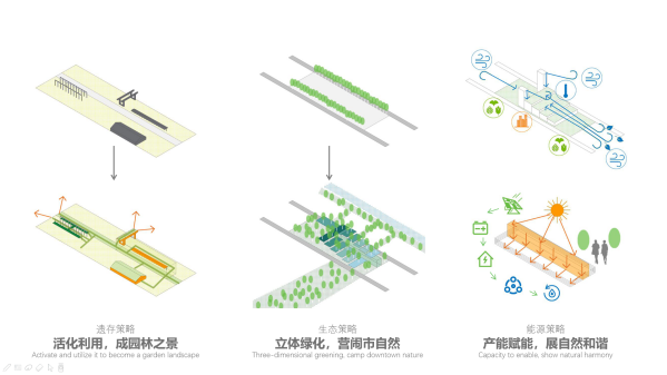 城市设计以“一带两轴六区”为结构,通过原宁芜铁路线为带,中华门-雨花台与南朝中轴两条历史轴线为轴,串联整个场地内部,与周边环境相连接;依托不同区域的规划约束与客观的资源禀赋,将场地分为六区:社区服务、高密住区、越城双阙、都市峡谷、文旅之门、演艺中心,东端更服务本地社区,西端更服务城市整体,中部在轨交站点核心区适当提高开发强度。梳理铁路系统后,团队从中选取具有代表性的站房、站台、铁轨及天车等物质遗存点进行改造更新,并将各部分融入到城市更新后的公共空间中,或作为景观构筑物,或作为公共建筑,在进行最大化的城市更新的同时,保留宁芜铁路完整历史气息。