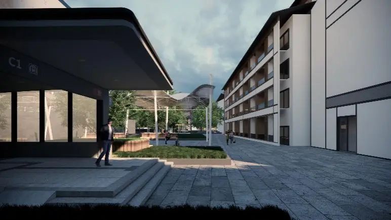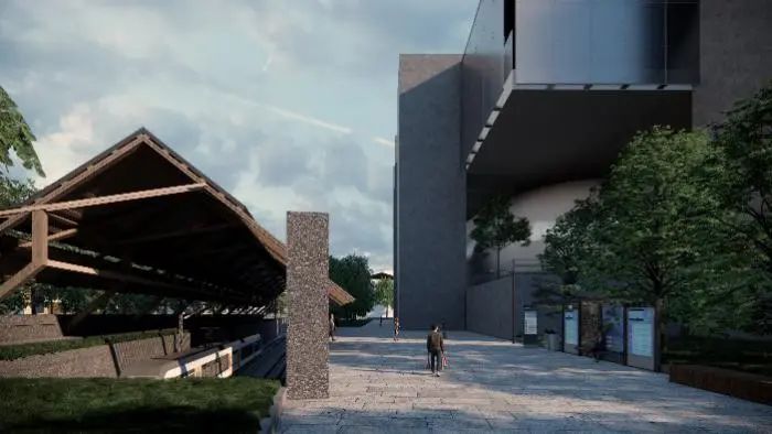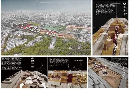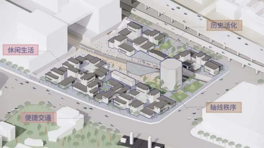 利用体量布置与空间操作,在场地整体内延续并强化整体城市设计的中轴秩序感,同时利用传统与现代结合的方式创造独特的文旅街区,活化场地内部历史建筑,将场地内部的老站房的形体以及结构进行保留以留住居民们最原始的记忆,在此基础上对其内部空间进行活化处理,赋予其新功能,创造特殊场地氛围;同时在交通上通过对有轨电车和地铁站与场地内部流线的衔接与设计,让整个场地中都能体验到快速换乘的便捷,使整个街区中的交通体验也更加丰富;独特轴线秩序、趣味文化街区、活化老站记忆、便捷丰富交通四者合一为,周围市民以及整个中华门地区提供一个独特历史文化体验之地。