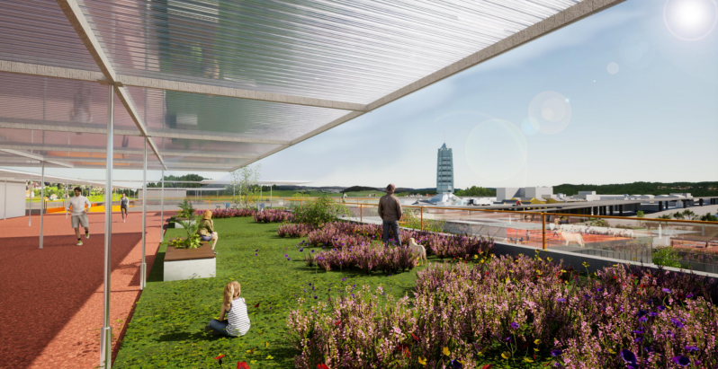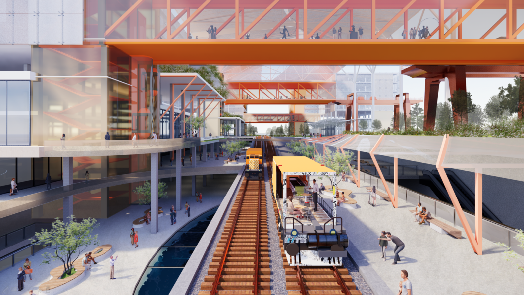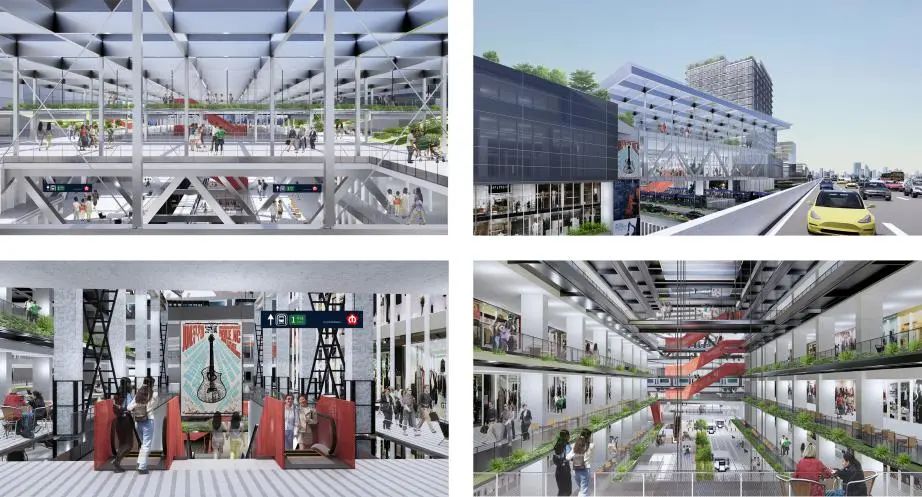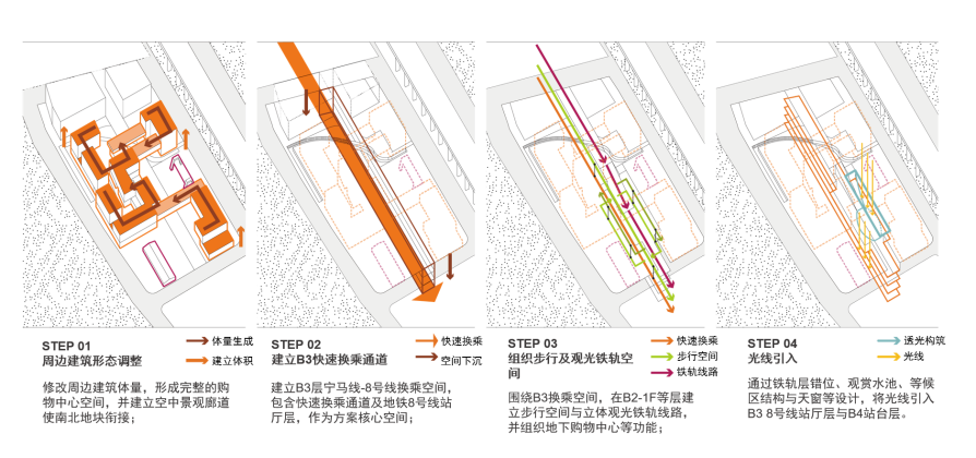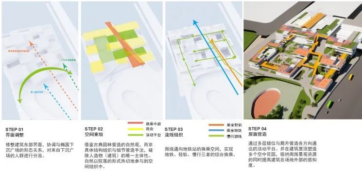 方案重点地段在剖面、平面上呈现多种空间形态。通过线性游览路径、线性快速换乘空间、围合式商业办公空间等组织主要功能区域的空间形态:通过楼层退让、公共平台下沉、特殊景观如曲面屋顶、观赏性水池等操作塑造地铁站出入口公共空间,并将光线层层引入地下四层至地铁站站厅层、站台层,使得交通枢纽与外界环境的联系更加紧密,将繁忙的商业、旅游观光、交通换乘的分为彼此连接、互相展示,行程具有特色的TOD站点景观。同时,通过保留铁轨等遗产要素作为线索,连接场地内各个景观区域,呈现场地的文脉特色。