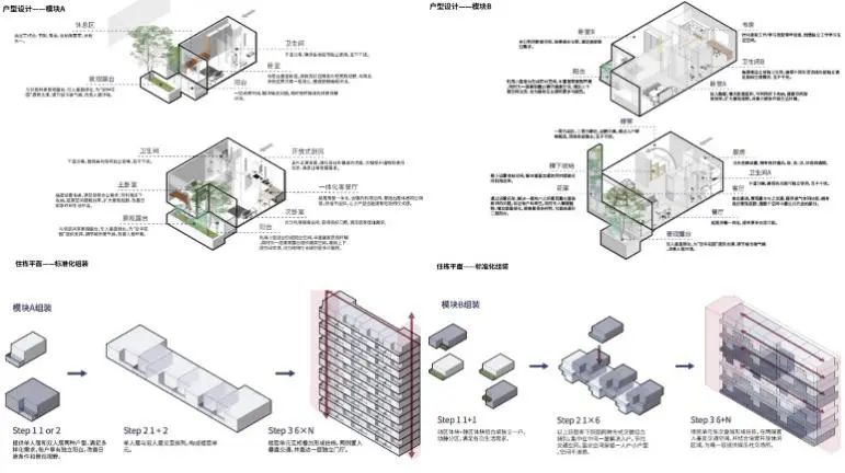 场地西南侧目前现状居住用地以老旧小区为主,而未来场地目标向城市新门户、高质量生活服务聚集发展,因此,在场地西侧地块进行高密住区布置,主要面向青年白领群体服务,并在底层结合公共交通置入小型商业、公园绿地、文化广场等公共空间,通过连续步行环境无缝对接至交通核心,并面向整个区域开放,提供了一种更便利、更积极、更丰富的生活方式。将地面道路及区域“归还”给城市交通,将生活空间和人行区域通过立体叠加的方式进行整合,在垂直方向完成生活空间、休闲空间和居住空间的置入,建立“空中社区”。在户型设计上,设计了两种不同的标准模块,以满足不同的生活需求,按需进行组装,并结合置入公区,激发社区活力。