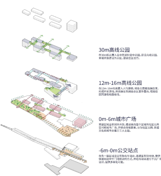 中部的核心片区-十字光谷与垂绿中庭一体化开发,复杂的地铁四线换乘以及其他交通的连接在此进行,并设置-5m、0m、5m、28m四个首层,主要功能为商业、办公等,东侧的漫游绿丘片区与西侧的轨线新村片区则通过地下通道与屋面绿道与核心片区连接,漫游绿丘连通雨花台的绿脉,并延续中华门-雨花台轴线,主要功能为文化等,而轨线新村则连接其周边社区、秦淮河绿廊等,主要功能为办公与社区配套。东西向沿保留铁轨设置慢行步道,串联沿线铁路遗存改造空间,标高随各首层空间高低起伏,打造游园式慢行路径。